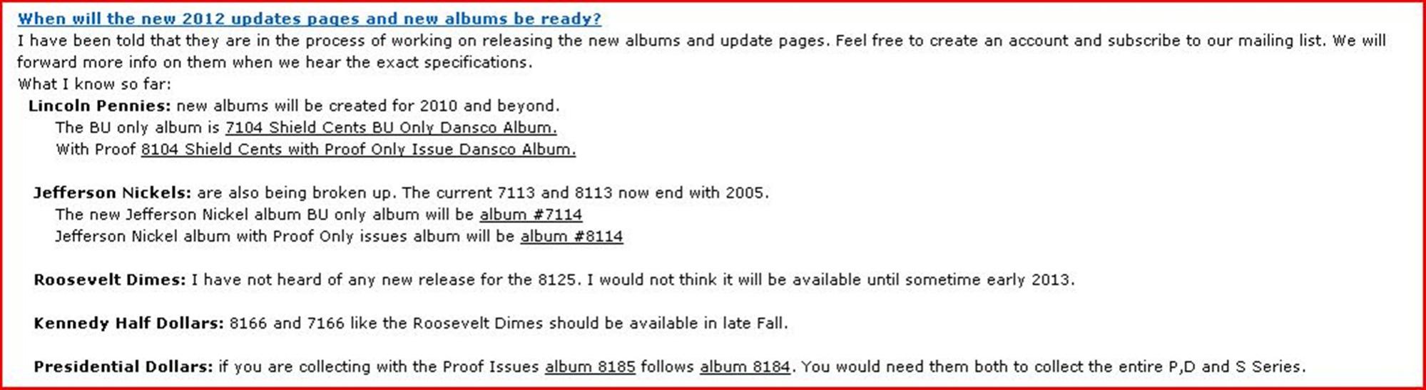 I fill my Danscos with the mint and proof sets I get each year, but I am running out of holes. Does anyone know when Dansco is going to release new supplement pages, and what they are going to do with some of the full albums? I only had enough holes to put away the cent, dime, and half this year. I am not worried about the quarters. I know I still need to get the Dansco for those. But the JFK book is now FULL. I have no more holes to put even this years proof coins, much less any future coins. The Jefferson book was full in 2011. So I will need the next page for that. The Dime book has one more hole... 13-P, and nothing beyond that. The Sac book was full as of 11. Then the POTUS book is like the quarter book... I need to get one. Album 2 of that series to be exact. So what is going on with Dansco? I have yet to find any update pages, and the new nickel books are now ending with 05, instead of 11 like my book. ???