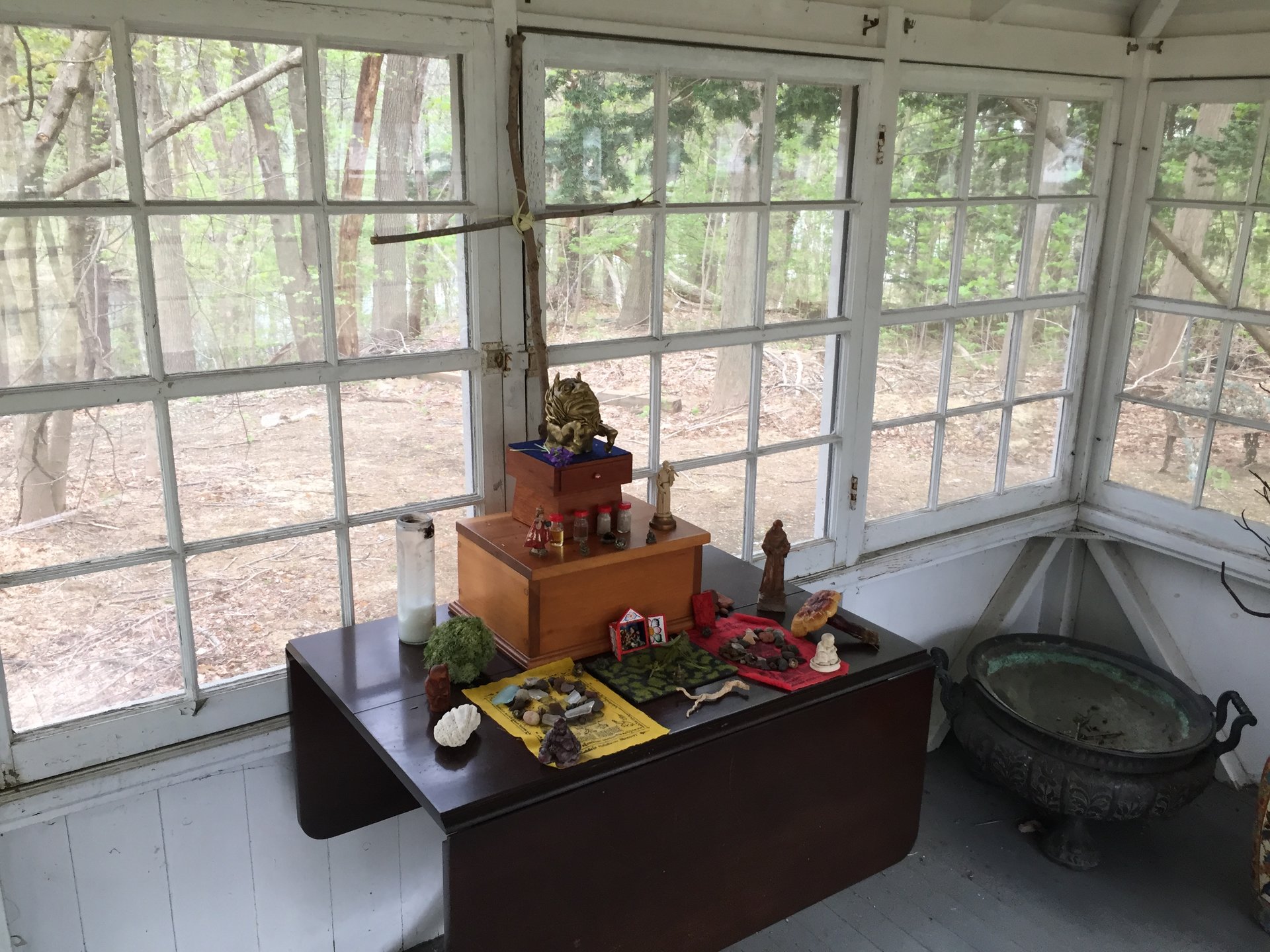 Mine is a Christian shrine but has a large Acheloios statue on the main altar and many other deities: Then there is Livy's altar: And Nico just started his: I repurposed an old caduceus so Zeus Meilichios is represented too (above Nico to right)