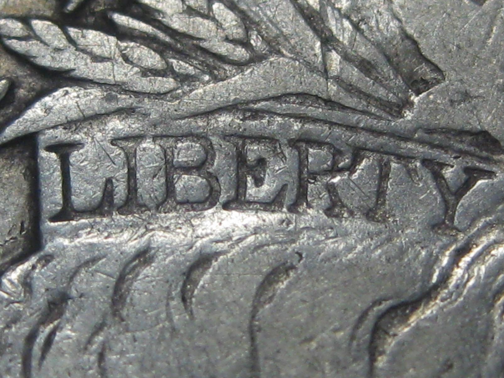 After looking closer, I noticed that there is a piece ofmetal coming off this area on about a 45 degree angle down and to the right,which, I think, would generally be called a die chip but it looks like it mayhave been removed from the location leading from the top of the "T"and down toward the "R". Is this common for a piece of metal to begouged out and then pressed back on the top of another part of the coin? I alsonoticed that there appears to have been something that gouged into the"R" pushing metal aside as it went into the "R".
