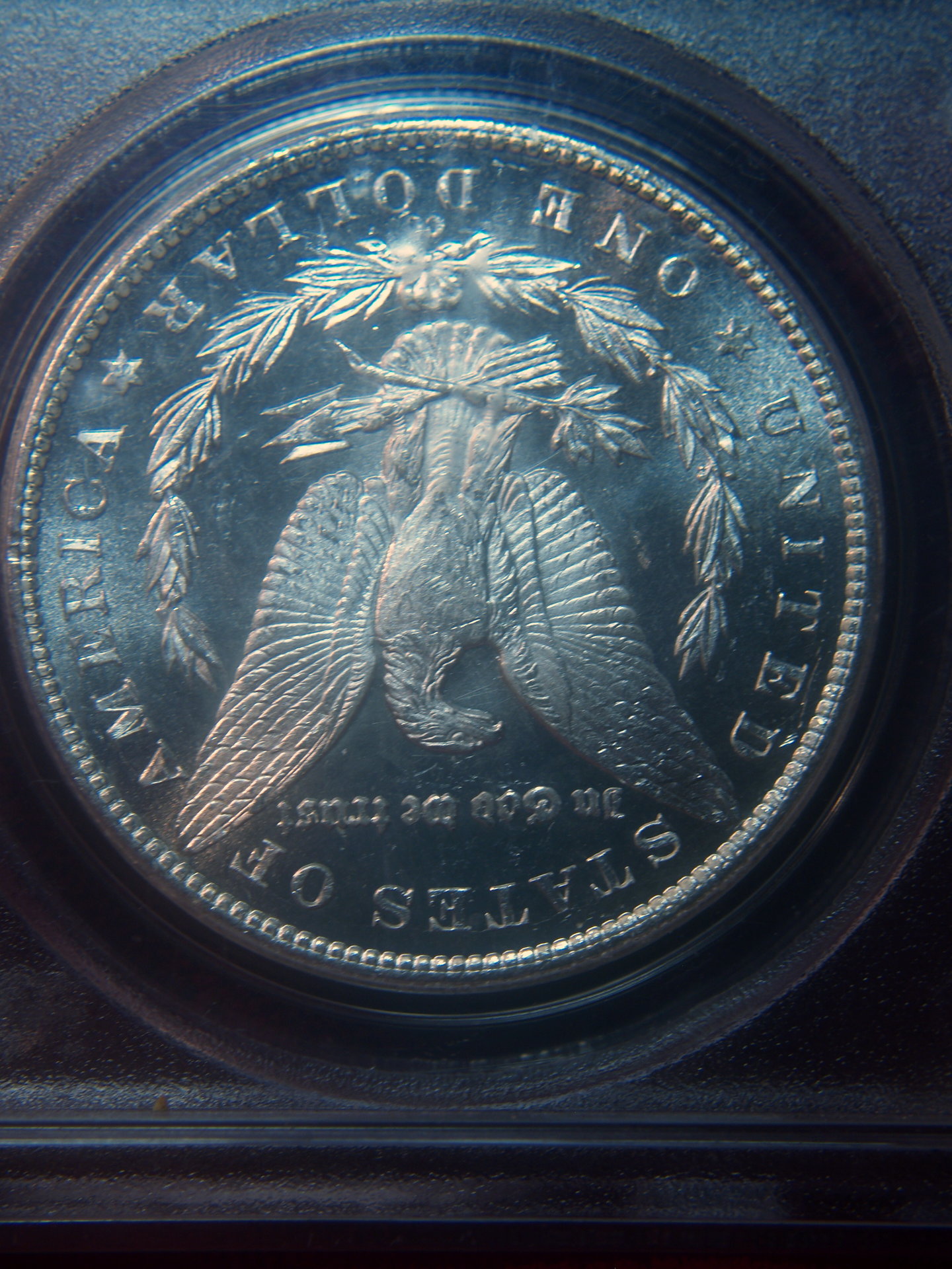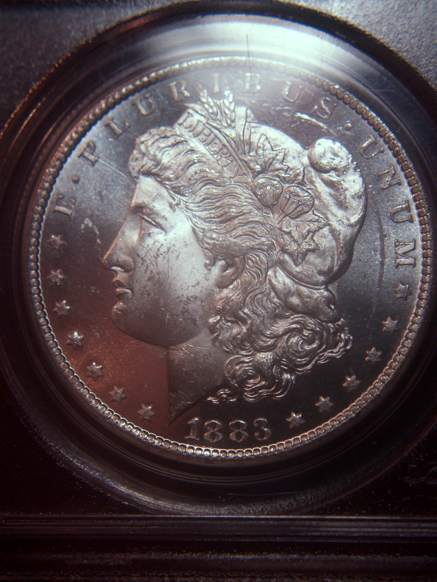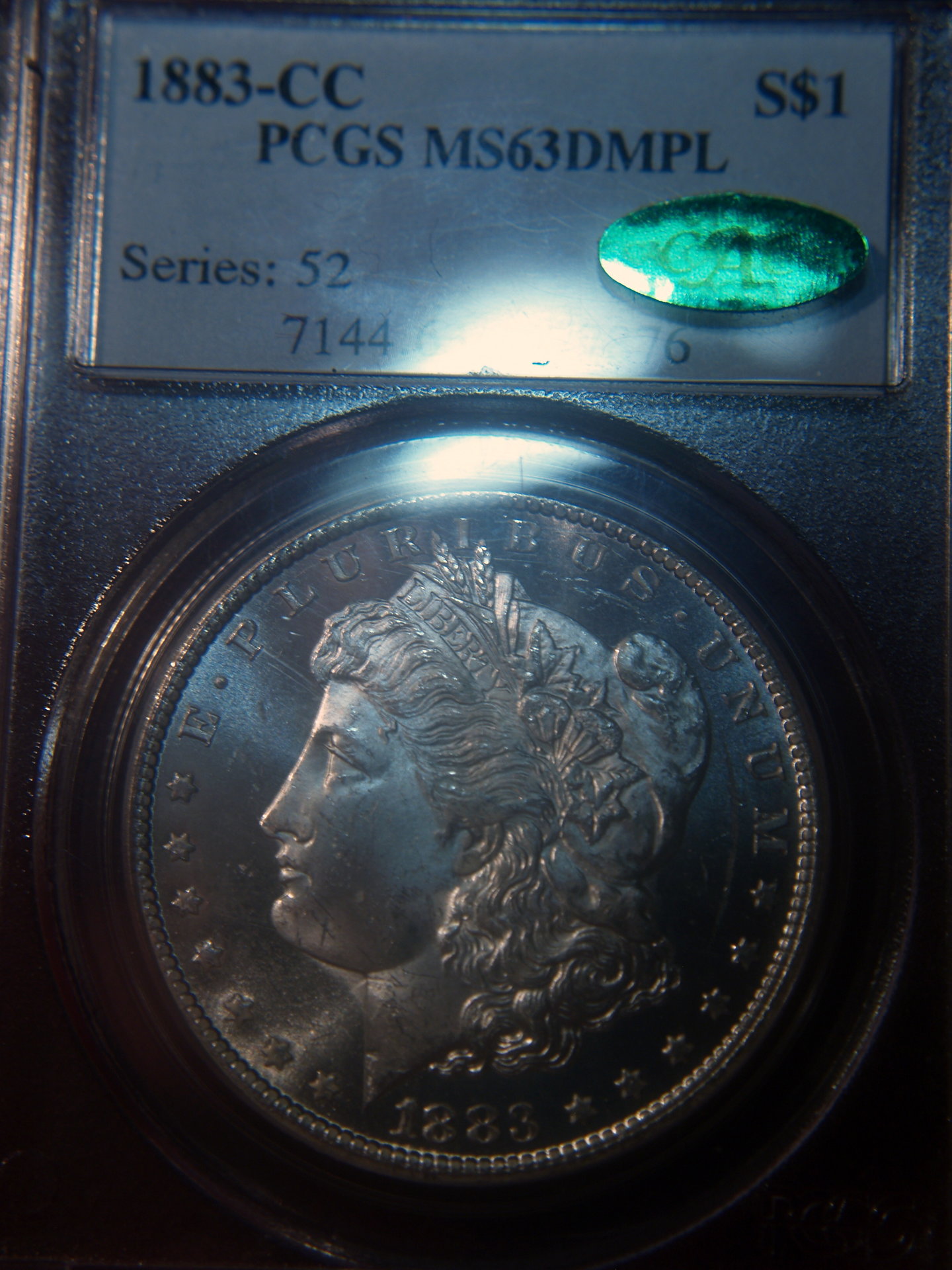 I may have paid too much again... I bought this coin at a coin show. At $450.00, some dealers there said they thought I got a good deal. (or course what would another dealer say?). The reasons I like it, for one it is a DMPL. At the show other dealers called this a Dimple. I is also graded, not by only PCGS but has a CAC sticker. It is also a CC Dollar! I don't know the exact mintage on this coin but I do know that not many were struck in Deep Mirror state.