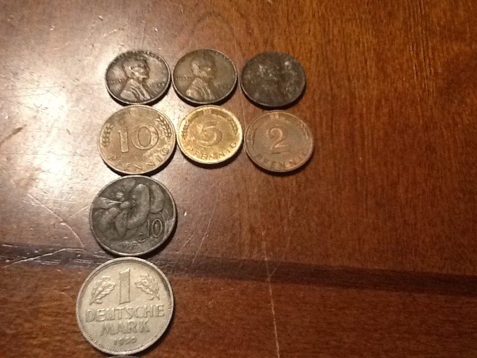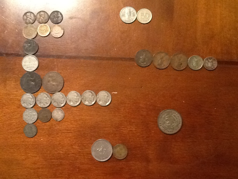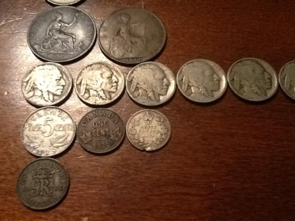 Don't know the value for anything aside from the American Coinage. I was given: U.S: 1936, 1925, 4 unknown date buffalo head nickles, 1940, 1944, 1943, 1928 (Great Condition) Cents Canada: 1928 Nickle, 1929 Cent, 1913 Dime Mexico: 1959 One Peso German Coinage: 1950 1 Deutsche Mark, 10 Pfennig, 5 Pfennig, 2 Pfennig Hong Kong: 1960 One Dollar, 1950 Ten Cents Filipinas: 1944(x3) One Centavo, 1938 Twenty Centavos, 1944 Five Centavos Unknown Coinage: 1927 C.10, 1942 Sixpence, 1973 "100" and 1984 "50" (I'm not very worried about the worth of these, just adding them to the list.) And my favorite recently gained coins, England: 1884 and 1914 One Pennies. if you know the worth of anything, feel free to help me. I'm mainly experienced in U.S. coins, so help with the others would be greatly appreciated.