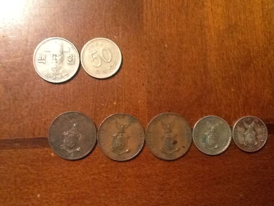 The 4th picture down the top two are South Korean 100 and 50 won. Worth about 13 cents with today's exchange rate.