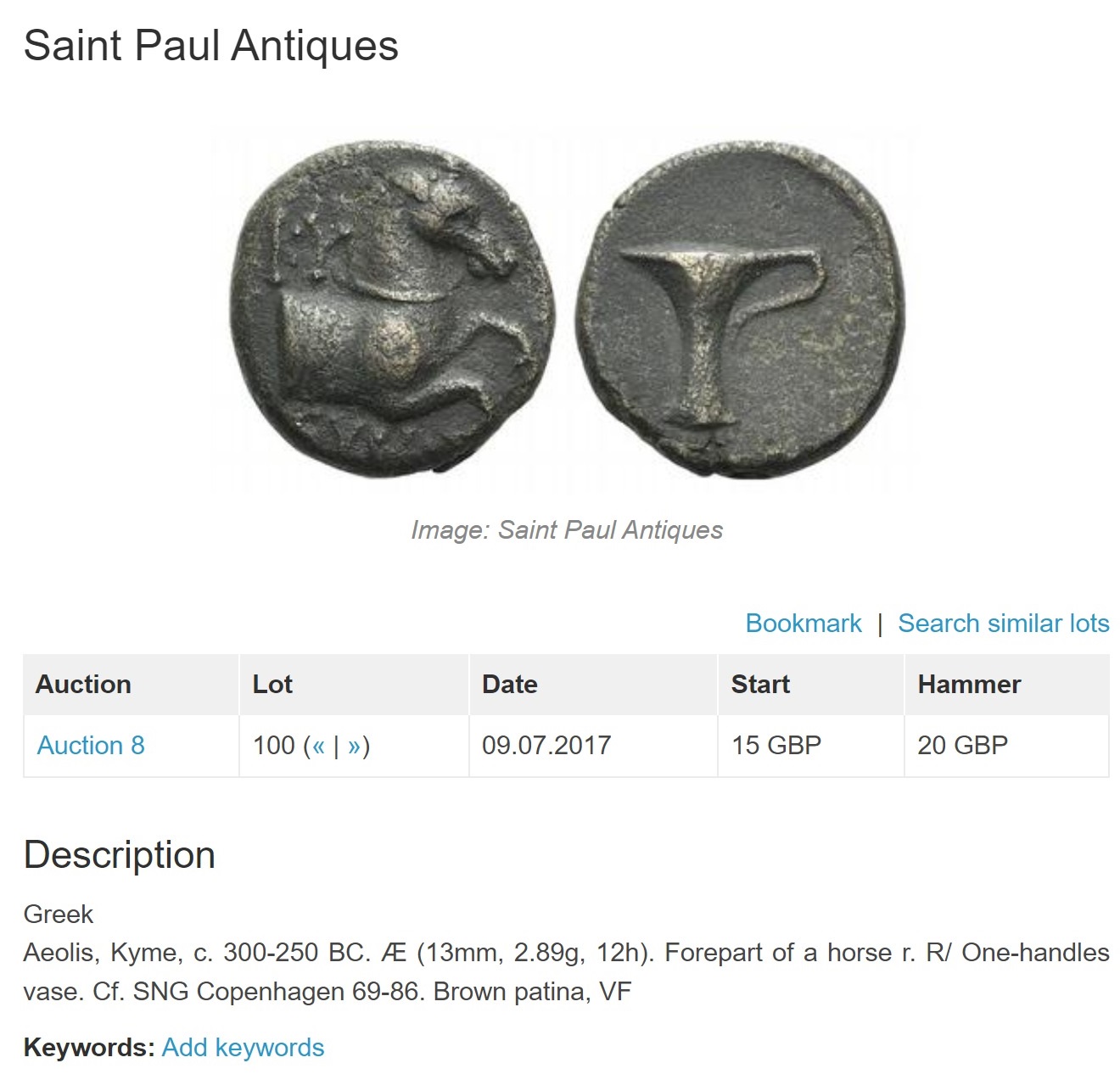 Yup, once you've seen them, quite recognizable as the medium size bronze from Aeolis, Kyme. Here's one I have photographed because I can't find this particular magistrate name elsewhere. (The type in general is very common, but certain magistrates can be scarce.) The one-handled vase is the most distinctive feature of Kyme's coinage. For comparison, here is a not-so-nice example of their tiny AE (about 10mm): And the distinctive extra-large (~32 x 36mm) Hellenistic Tetradrachm (the vase is under the horse's front leg):