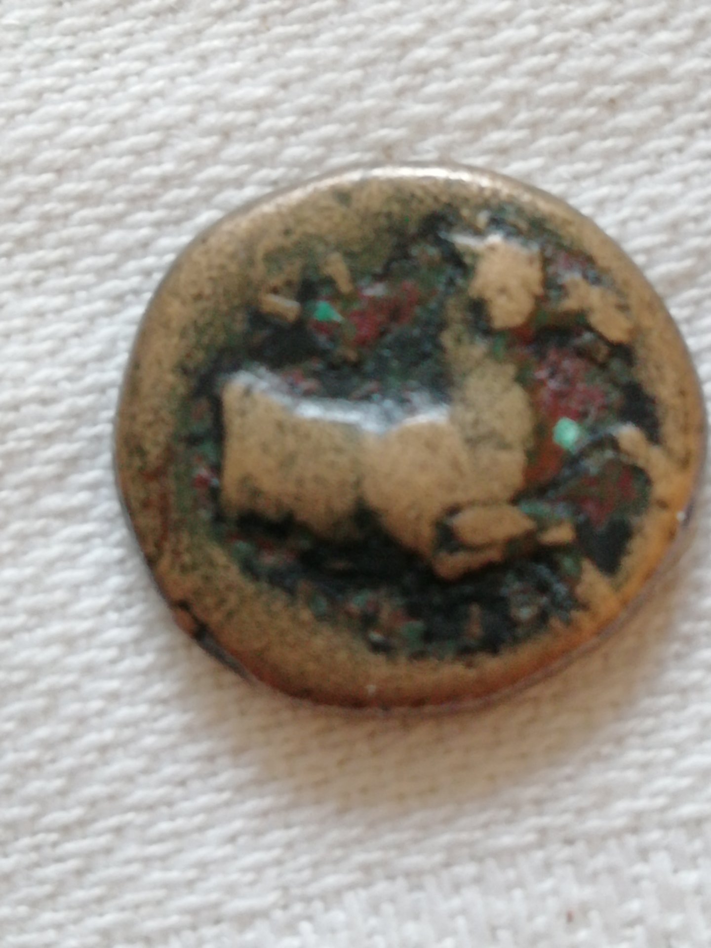 You will have to give the diameter and the weight. To me it looks like a stag/horse and then an alter of some sort.