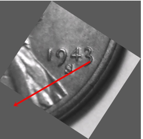 All the doubling on this coin is due to die deterioration. That's the "fancy shmancy" term for having been struck by a worn die. You'll see that doubling effect. You can also see what we call the "orange peel" effect on the surface of the fields (the flat background areas on a coin). The "orange peel" effect is a diagnostic used to determine that a coin has been struck by a very worn die. You can see the ripply look around the area of the rifle. That's orange peel.
