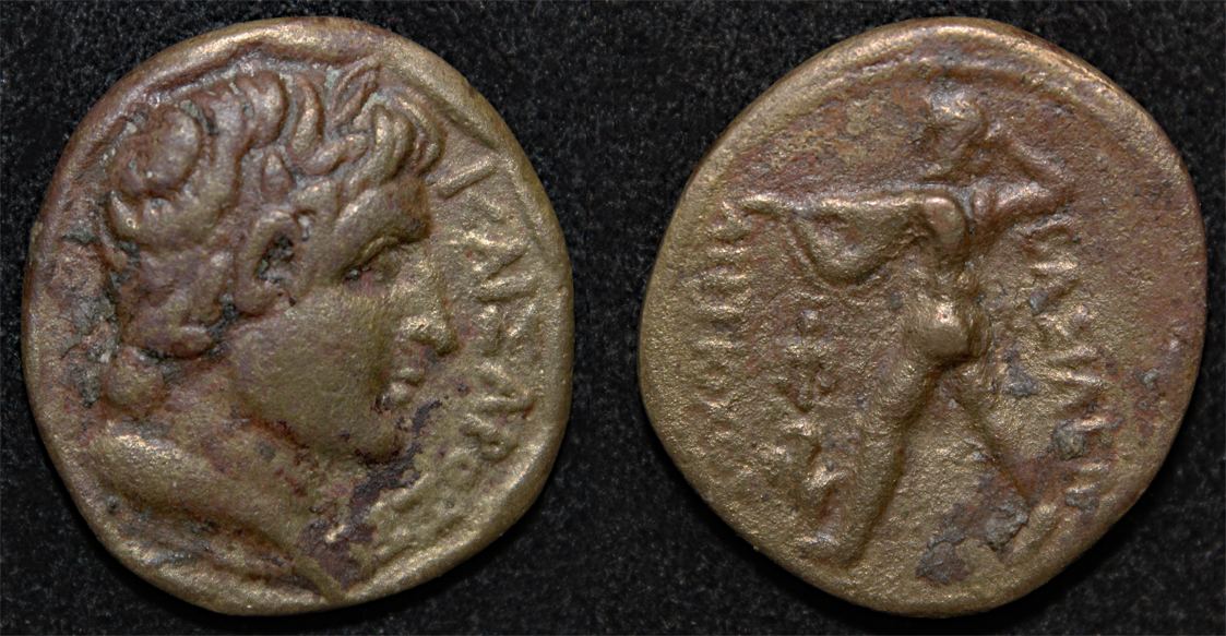 Not my area, I can read ΚΑΙΣΑΡΟΣ then 3 illegible characters, could it be ΣΕΒ (?) And on the other side ΒΑΣΙΛΕΩΣ ΑΝΤΙΟΧΟΥ. that narrows somewhat I hope
