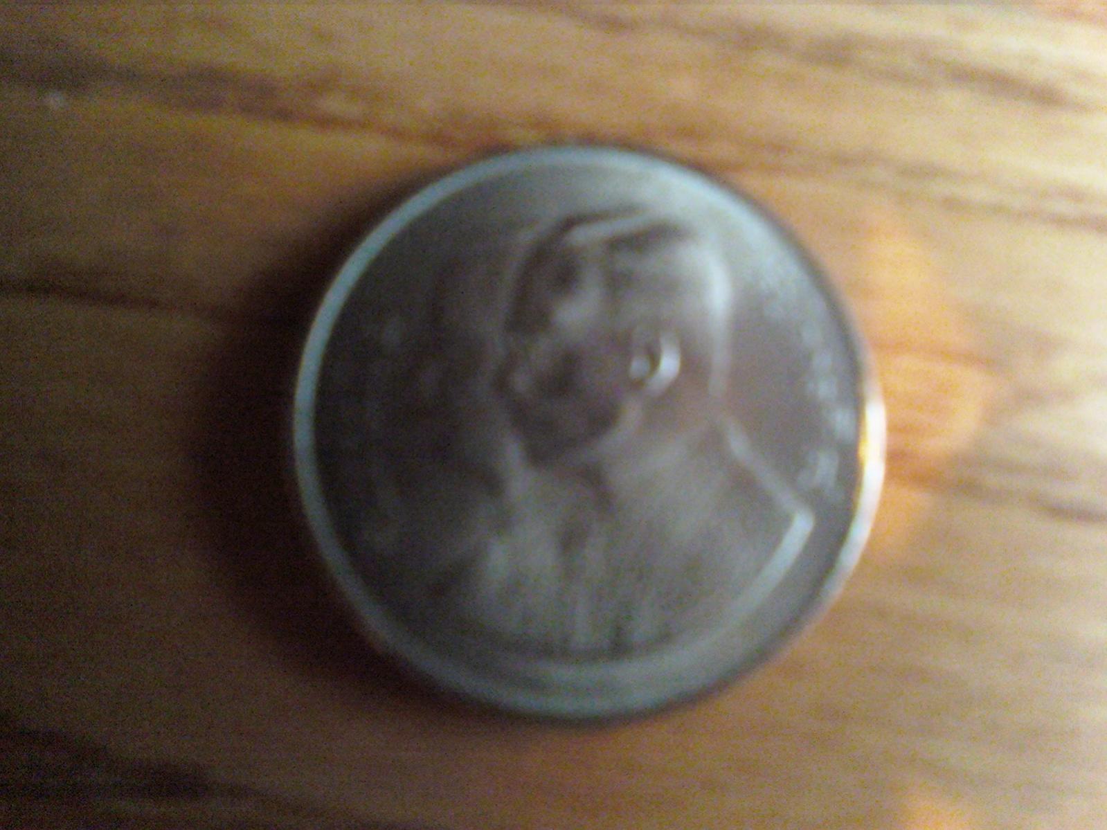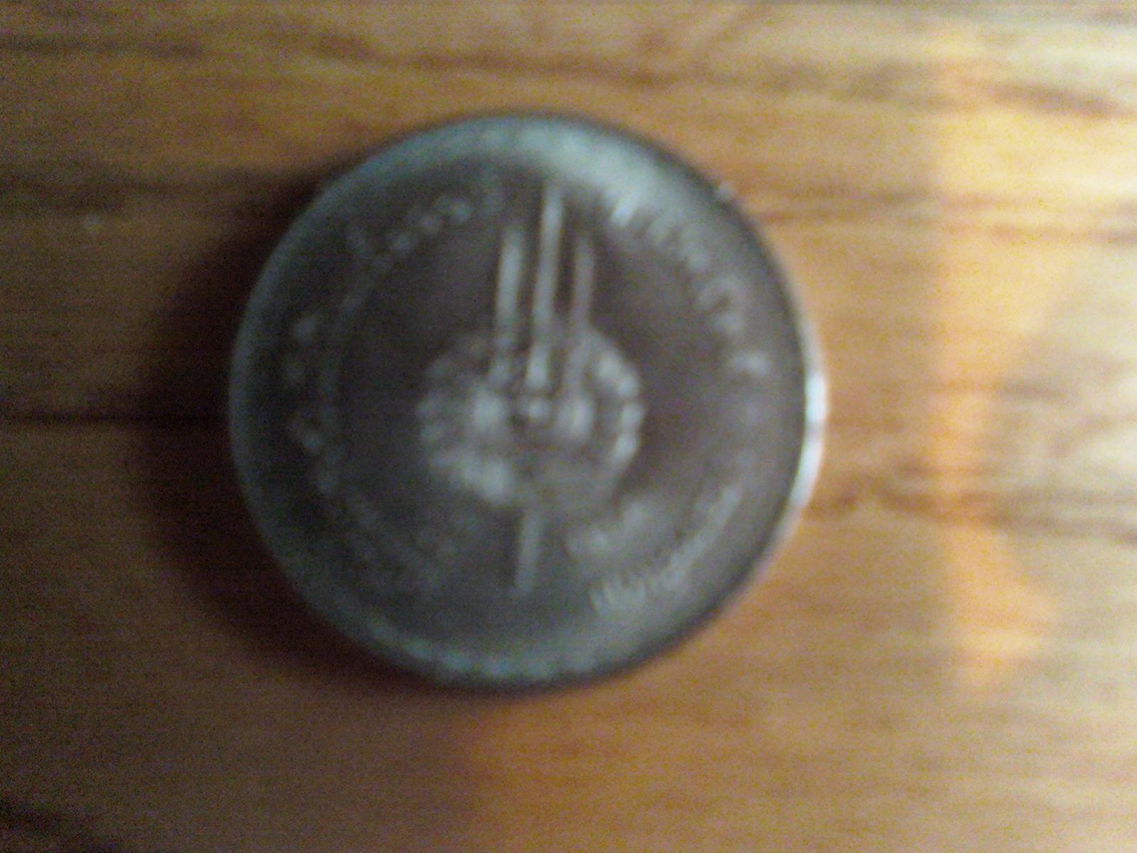 Coin ID Does anyone happen to know what this coin is? It is the size of a half dollar, looks clad and on one side there is a pitchfork with swirls around it in a circle and on the reverse side are two men's heads, one with glasses, the other without. The lettering looks Russian, but that's just my guess. Thanks! Sorry, used a crummy phone to take a pic, will try again tonight!