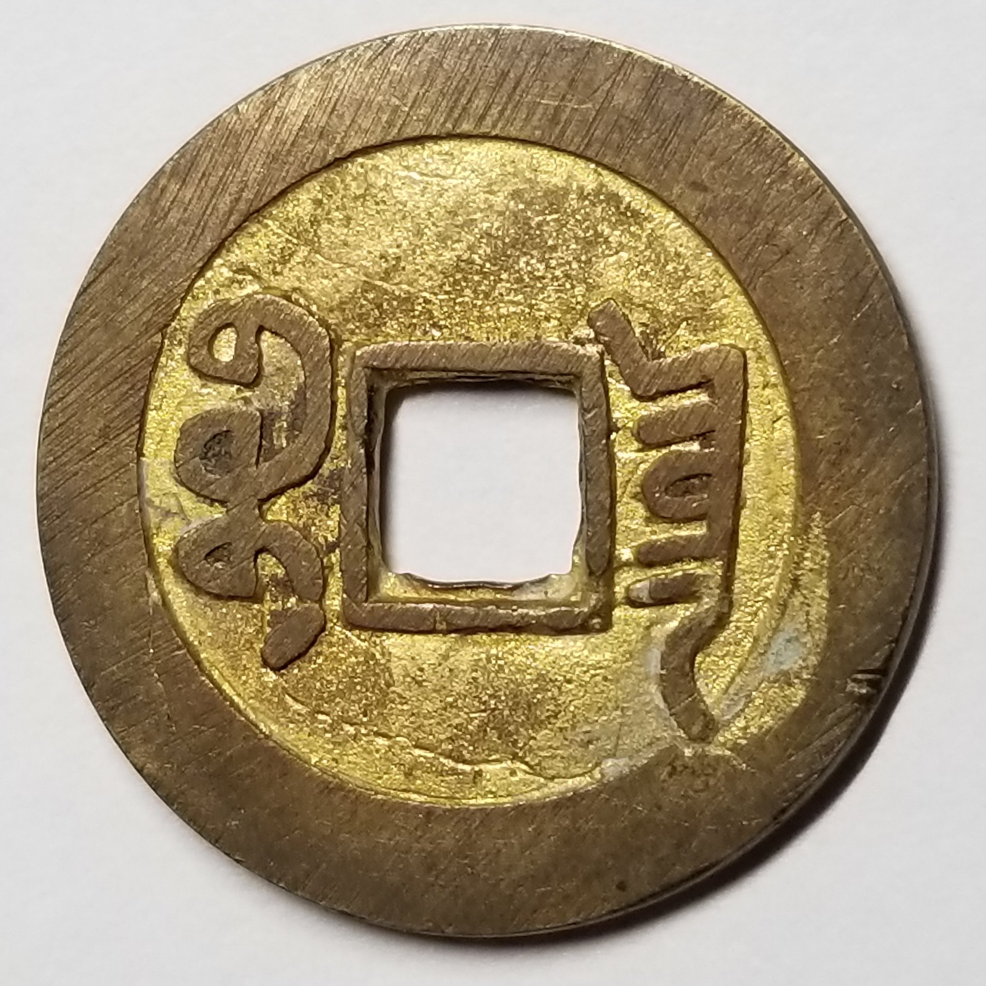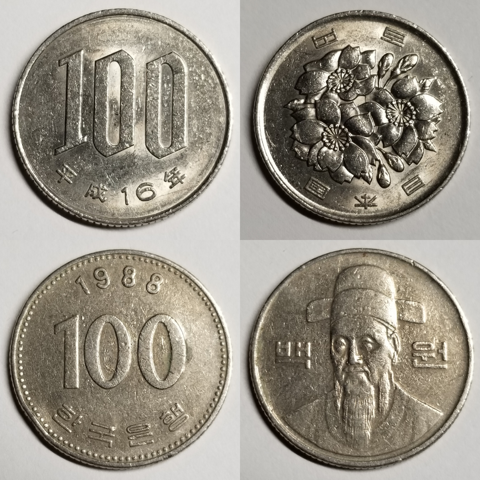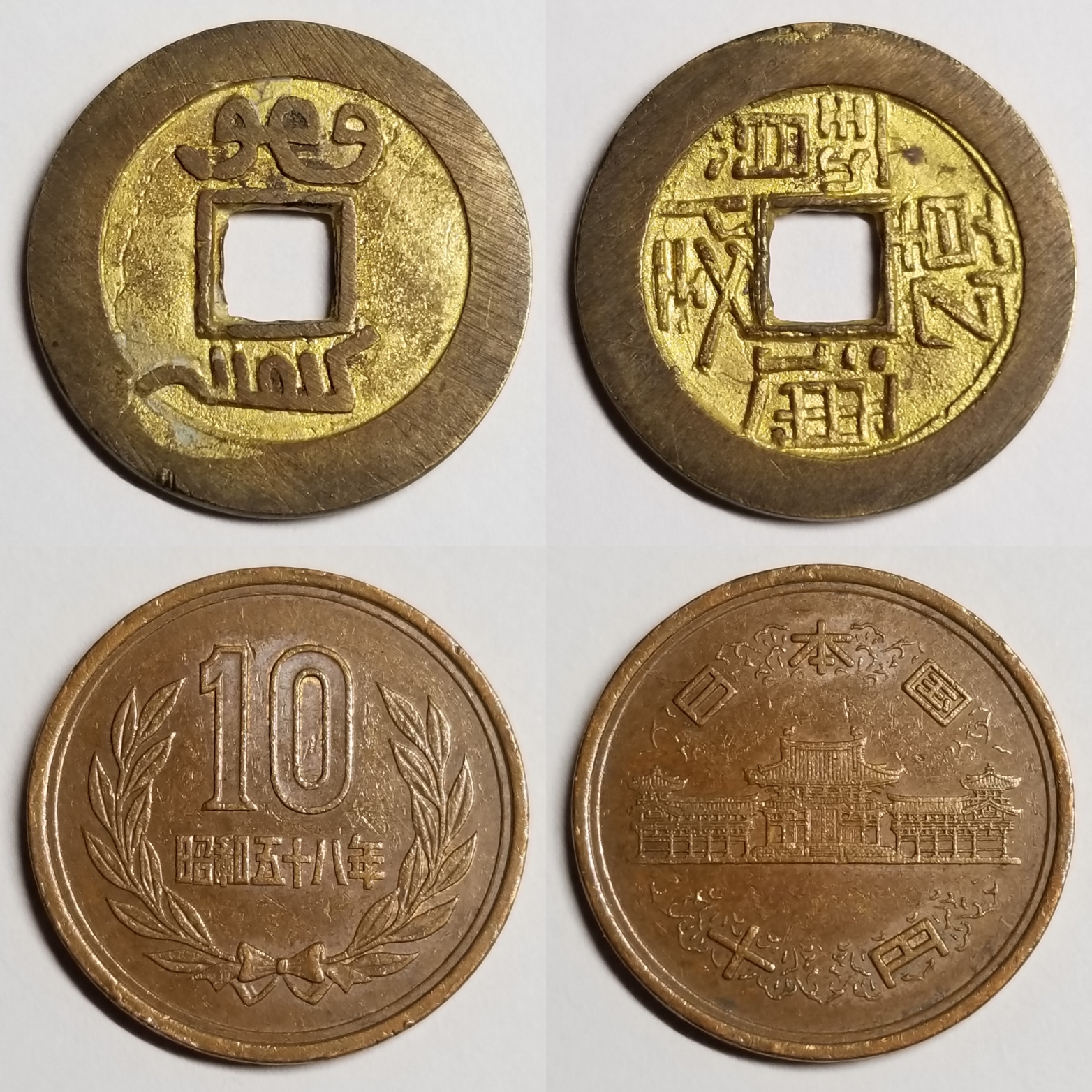 The Japanese 10 yen is Shōwa year 58 (1983). And the 100 yen you can see the date year 16~ which is Heisei year 16 (2004). We are currently in year 31 of the Heisei Emperor’s reign (Emperor Akihito)~although he is abdicating soon due to health reasons. Crown Prince Naruhito will become the new Emperor May 1st. The Chinese coin looks to be a copy, probably a souvenir token.