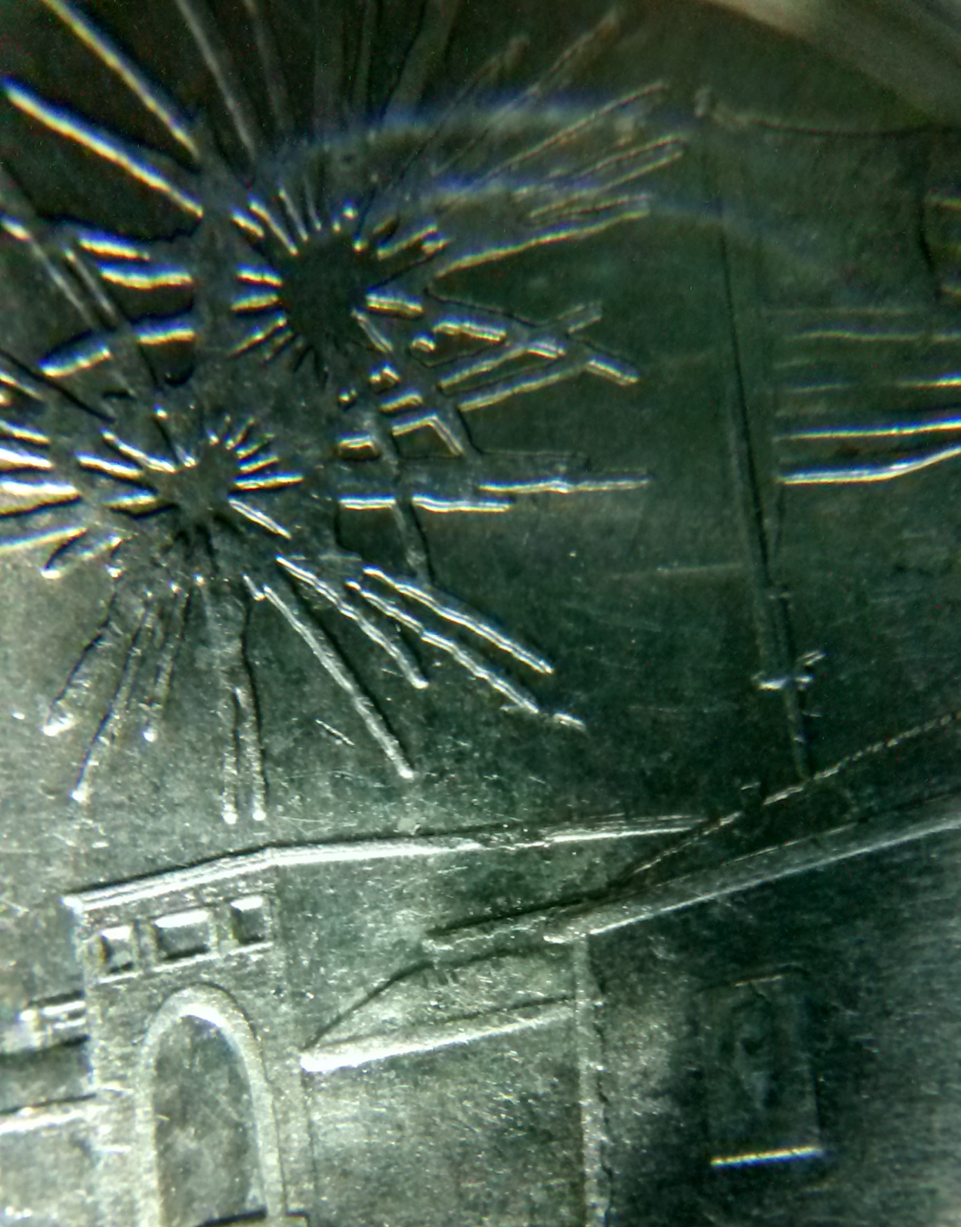 The problem is that the DDR is on the lower area of the fireworks spray: And the three windows above the arc: The area the OP shows is the uppper part of the fireworks. You can see in his image where the metal is pushed upward from the machine damage. On the DDR it is rounded.