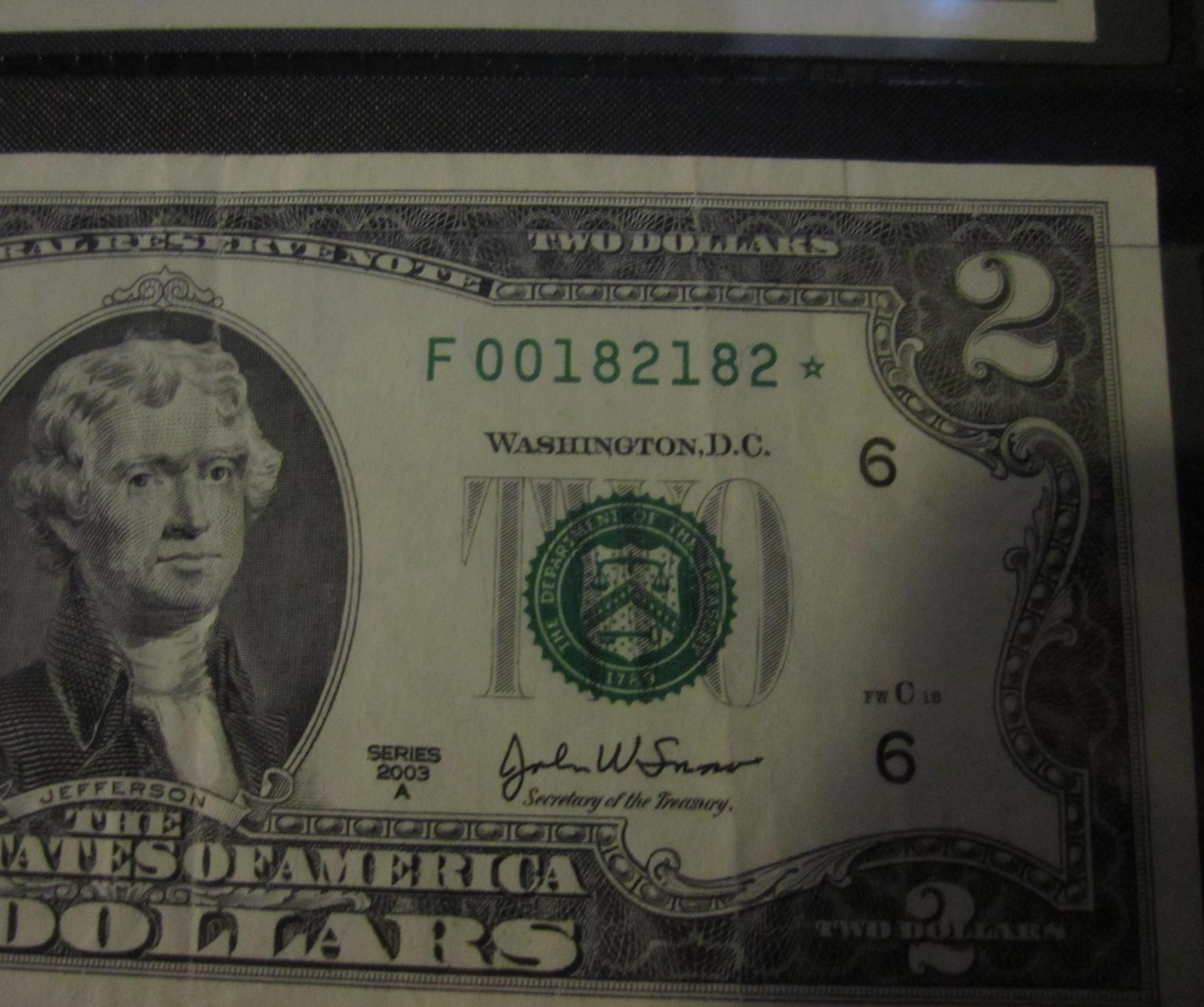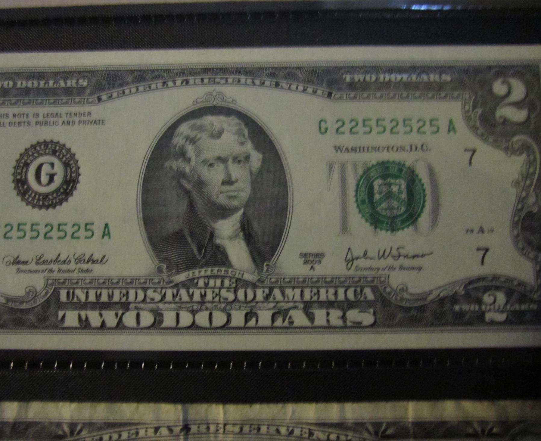 I second that. Today I came across a few notes I found to be very cool. No photos as of now, but they are crisp, uncirculated $2. Serial numbers : F03232626A(not so much when I got home..but eh what the hey) F99378293A