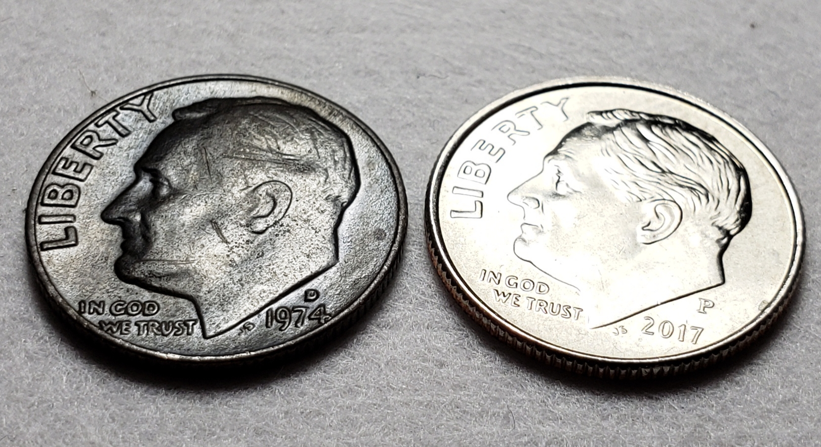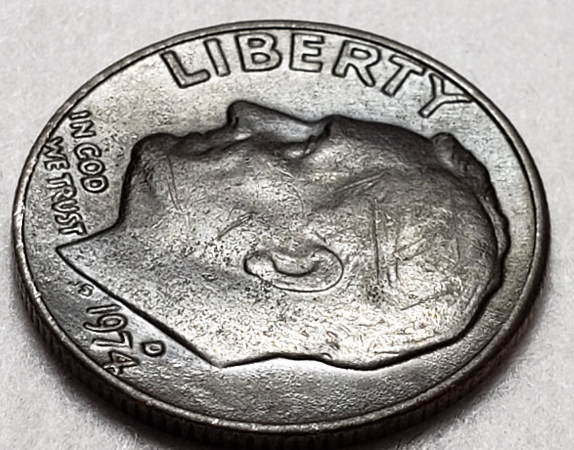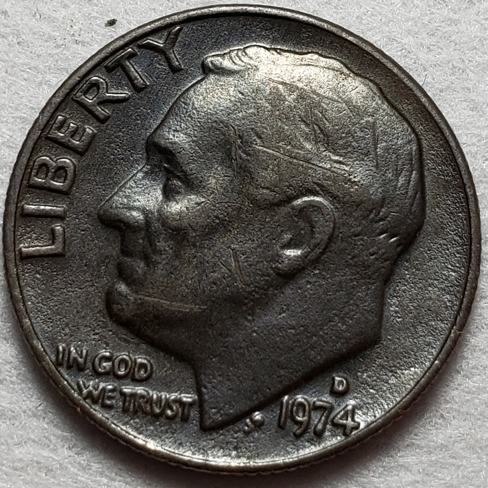 1974 Dime. Jet black with a nice luster. Weight 2.2 grams. Pretty good condition for a circulated coin. What do you guys think?