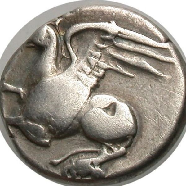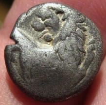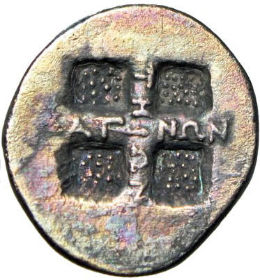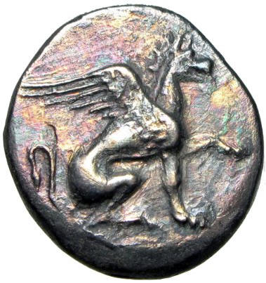 Chersonesos AR Hemidrachm 4th Century B.C. Diameter: 12.0 mm Weight: 2.0 grams Obverse: Forepart of lion Reverse: Quadripartite incuse square with amphora/pellet A Ionia, Teos AR Drachm Hagnon, Magistrate 375 B.C. Diameter: 16 mm Weight: 3.4 grams Obverse: Griffin (Gryphon) seated right, raising forepaw Reverse: Quadripartite incuse square with granulated quarters and thick crossbars; ZHI?N on horizontal crossbar, A?-N?N on vertical crossbar Reference: Kinns 11; SNG Copenhagen 1443