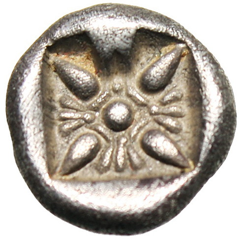 IONIA, Ephesos, AR Tetartemorion Circa 500-420 BC Diameter: 5 mm Weight: 0.17 grams Obverse: Bee Reverse: Head of eagle right within incuse square Reference: Karwiese Series IV; SNG Kayhan 126–34 Other: 12h … toned, Exceptional for issue