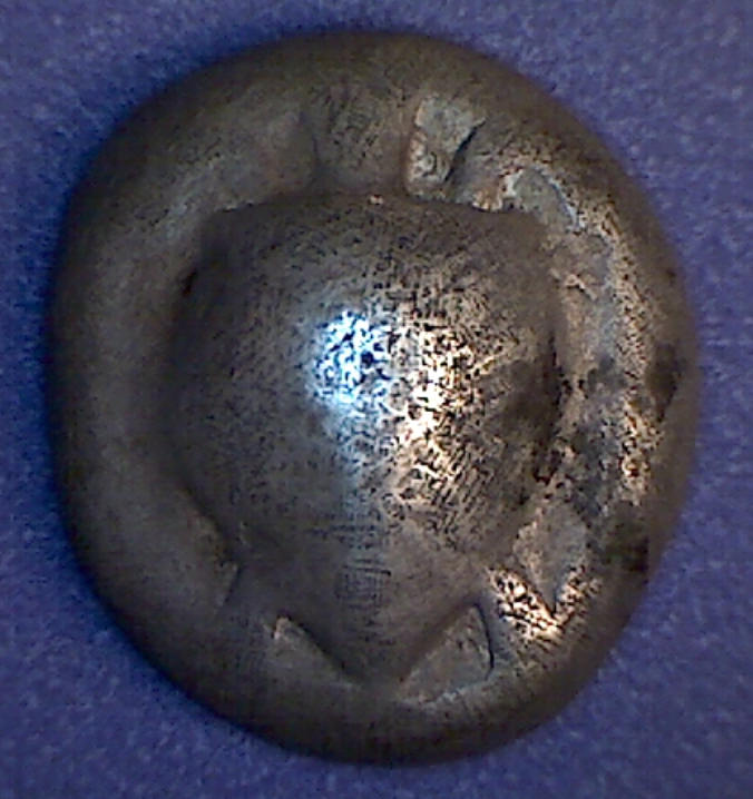 Attica Aegina AR Stater circa 480-457 B.C. Diameter: 19mm Weight: 11.76 grams Obverse: Smooth shell sea turtle Reverse: suare incuse skew pattern Reference: SNG Cop 507 Ionia, Miletos AR Obol, "Roaring Lion & Star Ornament" 475-325 B.C. Diameter: 9.5 mm Weight: 1.1 grams Obverse: Forepart of roaring lion Reverse: Star ornament within incuse square Reference: SNG Kayman: 476-487, Klein 424-425