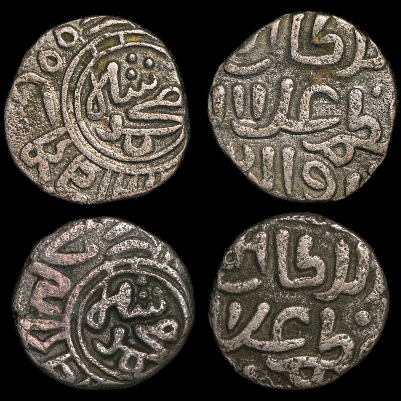 When this thread started last month, I knew nothing about the coin but happened to own the book so was able to study up on them. That, of course, made me want to own one. Fortunately they are pretty common and there were several for sale on eBay at that time. I decided that I wanted one that was off center in the direction that would show the year date even though that would cost an equal amount of the opposite side (ruler name) so I bid on two coins that fit the requirement. Considering that they are cheap coins, I am not upset that I won both. The top below shows the date most clearly in Hindi / Arabic numerals at the upper left of the obverse. As luck would have it '700' is about as close to our modern '700' as you can get. 700 AH is roughly Oct. 1300 to Sep. 1301. The other one is year 698 AH so it shares no numeral. Both are lower grade silver looking than the one that started this thread appears to be. This has always been the problem: Learn about a coin I don't have; Want an example; Buy another coin; Repeat.