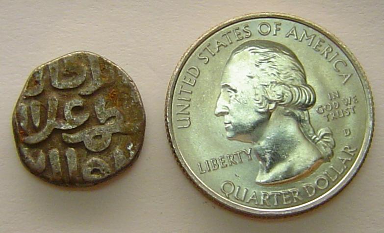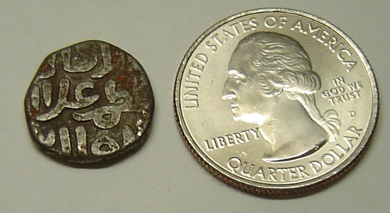 Okay, well I got this coin today at my coin shop, it was extremely inexpensive, but looked interesting. The only info I have is what they had written on the 2x2. It says: '1235 - 1313 India Silver Sultan Delhi Mohammed' so, since that isn't very helpful, I was hoping someone might recognize this coin type, and be able to tell me the denomination, and ruler, and all of that good stuff.....I know it would be hard to guess the denomination, but I put a U.S. Quarter next to it for size comparison anyway. I may not have the coin oriented properly. Much thanks.