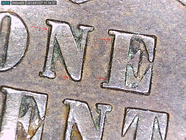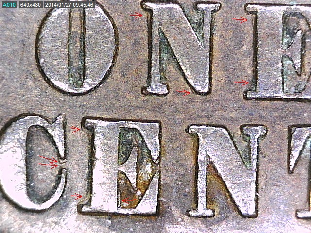 Mostly they are some sort of a die, Im just not sure what kind. I have arrows pointing where to look on the Indian cent. The lincoln has some dies as well and also a line that runs through in god we trust