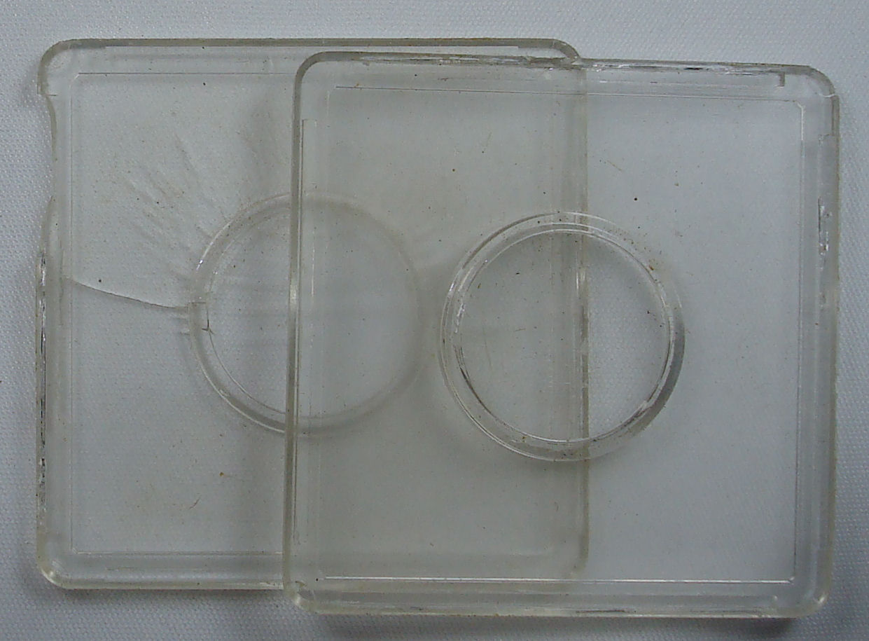 It appears to be residue from PVC from the holder. I would give it a xylene soak to try and remove that residue. Then a rinse in distilled water. Let it air dry then place it in a new PVC free air-tite.