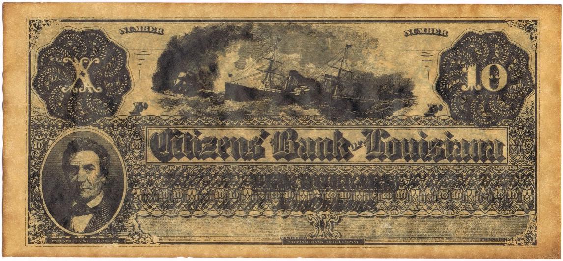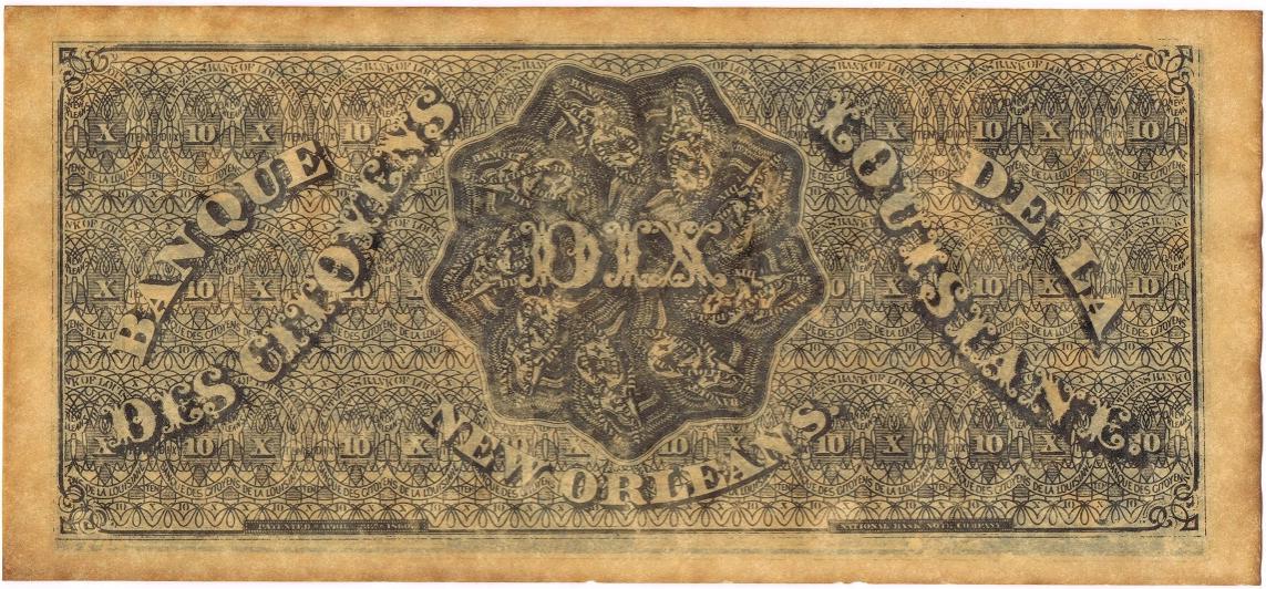 "Way Down South in Dixie" The term Dixie we have all come to know as meaning the Deep South, was born in Louisiana prier to the Civil War. Prior to the Civil War the economy in the port City of New Orleans was literally bursting at the seams. The levee on the riverfront was lined for miles with steamboats and there was virtually no room to store the cargos brought to the port. Like the cargo, money was flowing like water and the prevalent bill was the $10 bill. New Orleans at this time in history was still a divided city with Canal Street serving as the neutral ground between the Americans and the Creoles. After selling their cargos and wishing to spend their money, the keel boatmen were inconvenienced by having to use French money on the down river side of Canal Street and American currency on the up river side. The enterprising Citizens Bank, located on Toulouse Street solved the problem. They simply printed on the face both in English and French the denomination Ten-DIX. DIX is ten in French and the keel boatmen corrupted the word by saying, "We're going to New Orleans to get some of those good old Dixies". Hence the deep south has been known as the land of Dixie ever since. This note is a reprint from the original plates.