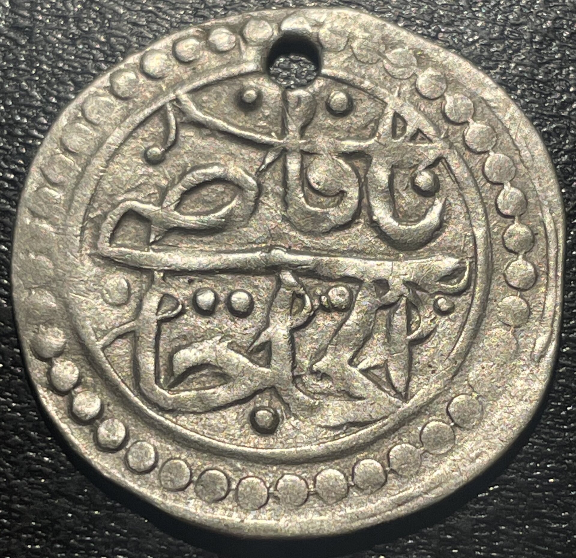 I go through a lot of foreign coins and I have never seen anything like this before. I don't read Arabic, nor do I know much about Islamic Coins. I believe this coin could be Qajar dynasty or from the Mughal empire. Let me know if you have any information about the coin. It weighs 1.83 grams and has a diameter of 22.4-23.1mm.