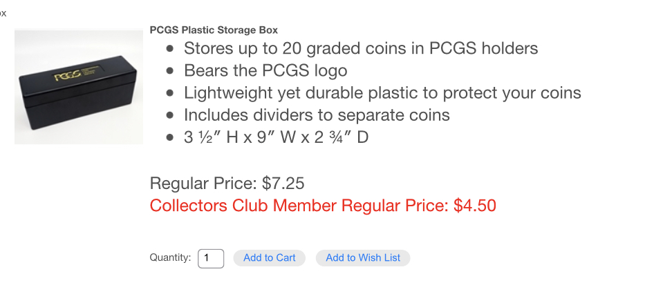 I would really love one of these. They sell for $4.50 on the PCGS site (for members but they cost $7.25 for nonmembers) but I refused to pay $10 shipping on a $4.50 purchase so I’m hoping they send my 18 slabbed coins back in one of those boxes.
