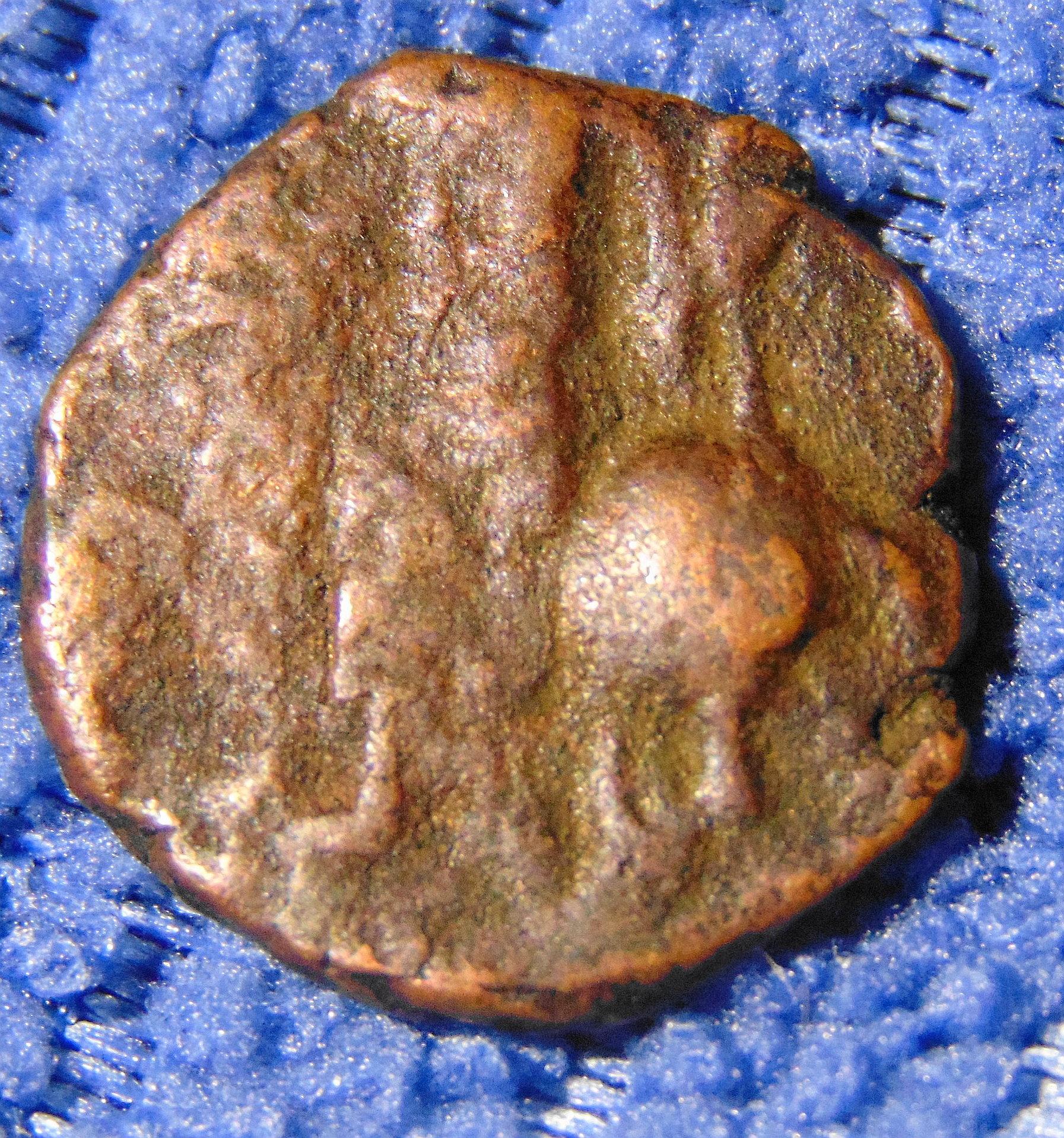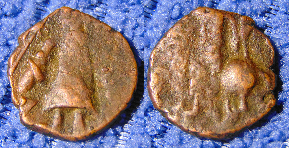 They may be crude, but users were confronted every time they handled these with the authority of both the ruler and Shiva. This is another of the Kushan designs you may encounter is various stages of abstraction from post-Kushan times: On the left again the standing king. On the right the seated goddess Ardochsho with wreath and horn of plenty.