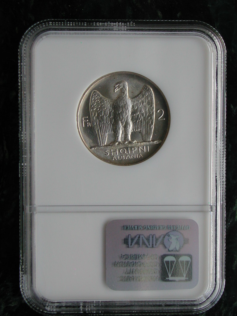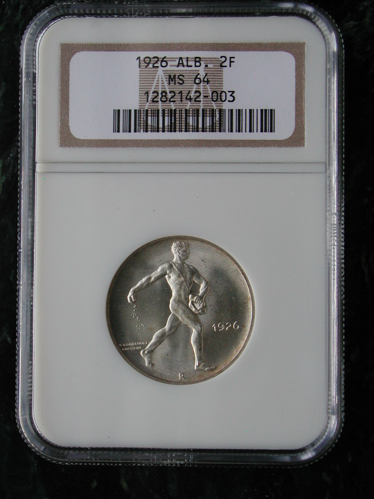 Nope, I'm not Albanian. I bought a used 1994 twin century Krause catalog in 1995 and only made it to the Albanian section before I was so enamored I couldn't get any further in the catalog. Well, not exactly, --I did in fact make it through the rest of the book-- but you get the idea. If I had to be a little more specific about my attraction, it would be the work of Guiesseppe Romagnoli that I find so irresistable. And so in addition to Albania, I also have a decent collection of Italian coins, and even Somalia since at one time (even up 1950 our pal Romagnoli was still designing coins) the coins of Somalia were also struck at the Rome mint. If you paid $3300 for the 1927 Star-Star in MS62 then you probably got a reasonable deal provided its accurately graded. I had 8 of the 9 coins for quite some time before I finally purchased the last one I needed, the 1926 Single Star. I had seen a bunch of others in auctions that were spotted bad or had other problems. Saw one that was graded as MS62 that was pretty beat-up. Finally, I decided it was better to settle for a decent looking AU58 (from Mark Teller, $2450) than to keep looking forever. I had gotten close one time previously 6 or 7 years ago when I purchased an 1926 Single Star from Clark Smith raw for $995, then sent it to PCGS only to have it come back as "questionable authenticity" --I returned the coin to Smith for a refund. He then sent it to NGC, got it slabbed as MS62, and then offered the same coin to me for $2,000.00 Needless to say, its one of the reasons I no longer buy many coins from him. I too, own all the minors, including multiples of most of them. the 5 and 10 qindar lek are much more common now than they were 7 or 8 years ago. Yet prices have held-up reasonably well on them in spite of the increase in supply. Ie I were to give any guidance on collecting the minors, it would be this: The 1926 coins are far more plentiful than the later years. There are a fair number of the 1927 issues too, but once you get to 1930 and 1931 they become much more scarce in mint state (circulated, plentiful), yet they carry the same price. Hence, if you see a 1930-V (struck in Vienna) or a 1931-L (struck in London) cupronickel 1 Lek slabbed as MS65 or better for the same price as a 1926 in MS65, for-sure jump on it, as its probably worth multiples of the 1926 price in my opinion though the catalogs don't really show it. On the 1926 Albania 2 Franga, I paid $200 for it at the Chicago Internation Coin Fair in 1996. It was one of the first coins in the Albanian collection. Like yours, MS64. Another coin with a solid shot at a higher grade. I think it would CAC in a 66 holder, but then I'm the owner so I'm a little biased.