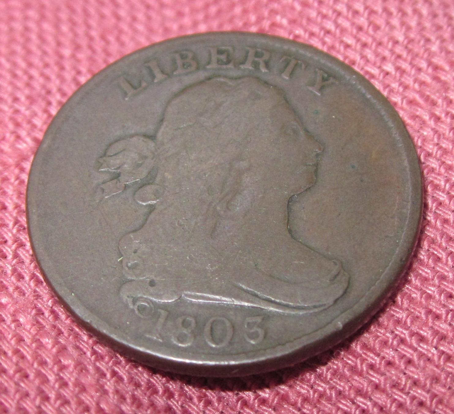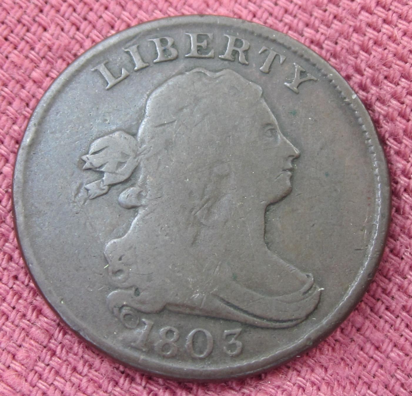 Nice half cent, it's the cohen 3 variety which is one of the two common varieties for 03. Not sure off hand of the exact die state, but I think it's latter, the bulge of metal by the date is from the die sinking. Surfaces look very nice, I would grade it around an 8 or 6 with no deductions. Not sure of the exact value, but I would buy it for $30 as well
