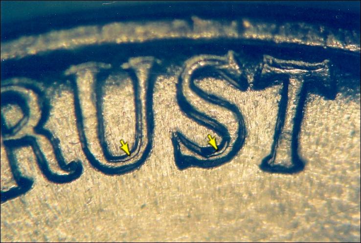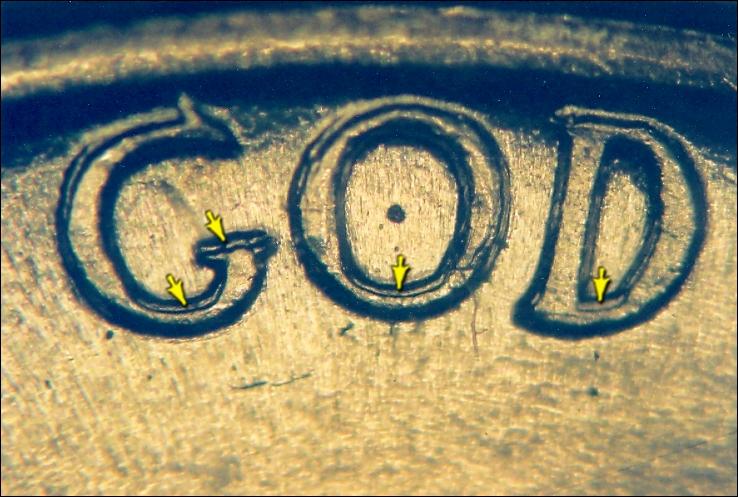 Interesting. That is different from mine though. I just looked at mine again and I think the "U" on TRUST has doubling. Will post pics tomorrow. I don't see the doubling on the areas you specified though. Could there be different dies? I also see an upward bubble/blob between the W & E and the "O" in God may or may not have thickness on the inside of the "O"... similar to the "9" in the date. (It's tough to tell b/c of all the crud.) Ughh...If I could just rinse the dirt off this would be so much easier.
