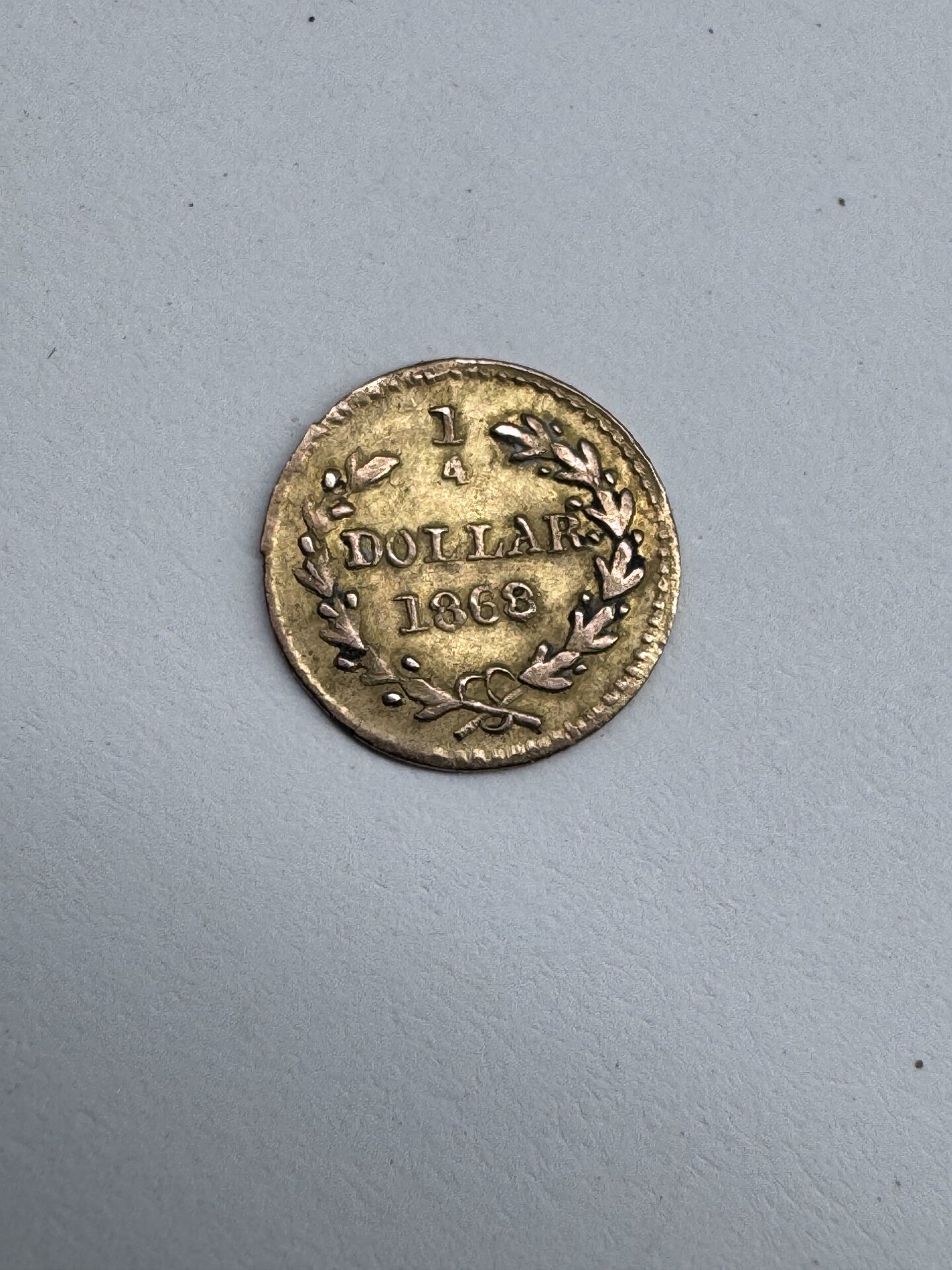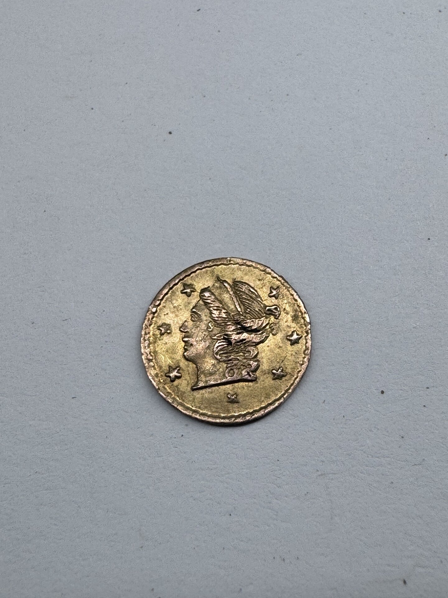 Looks like a $1.00 gold Liberty round coin. Minted by a private mint, not the US mint. A California gold piece from the gold rush. Should be in the Red Book.