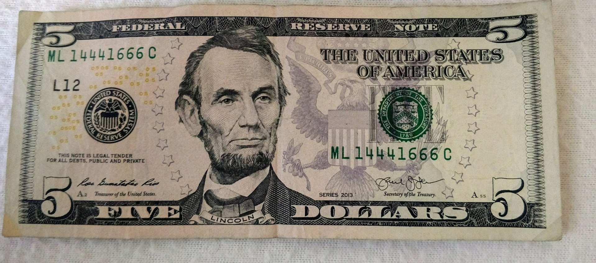 Good morning everyone! This is actually my venture in US paper currency. I mostly collect coins, US coins to be exact. Anyway, I came across this 5 dollar bill after I exchanged several roll of pennies. I check the serial numbers of the bills I receive every now and then. This one kinda caught my eye. I need to buy a 100 feet speaker wire and I am short five bucks. So I need your opinion; should I save this or spend it? Looking forward for your comments, input and advice. The fate of my surround sound is in your hands. Thanks everyone.