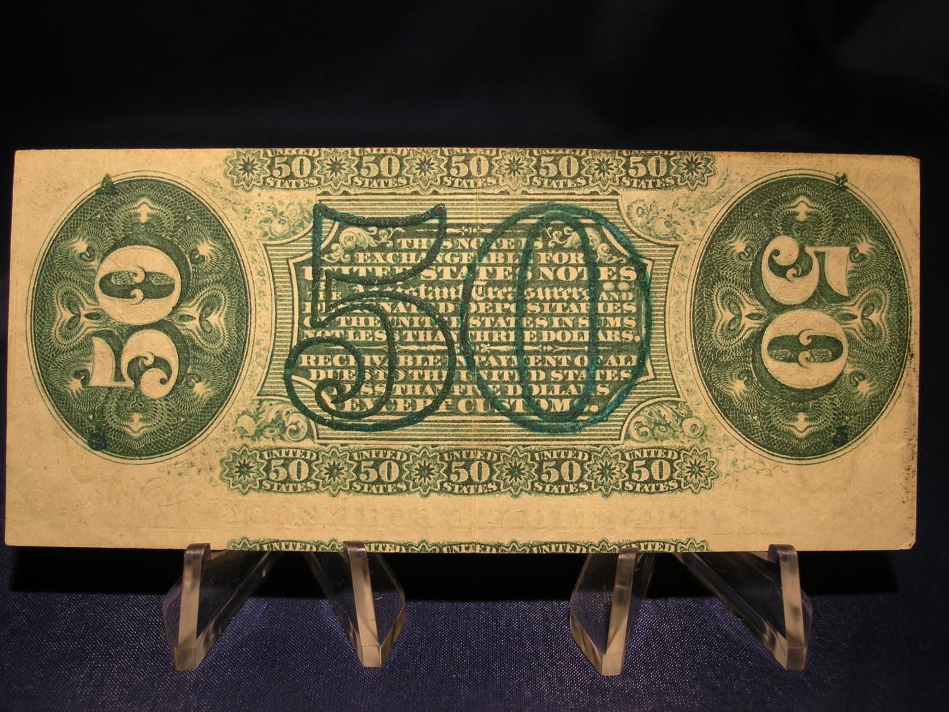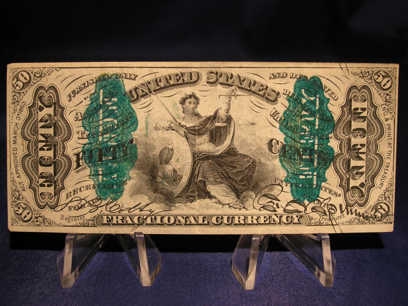 I found a justice 50 cent fractional with green instead of the bronze color on Heritage. They attributed the green color due to oxidation. http://www.icollector.com/Fr-1370-50c-Third-Issue-Justice-About-New-The_i6824143 LSM