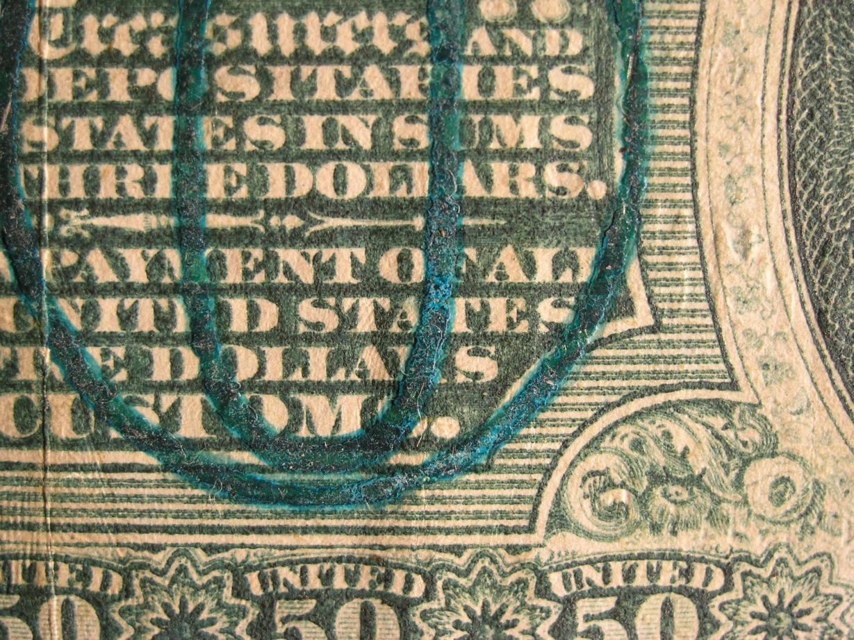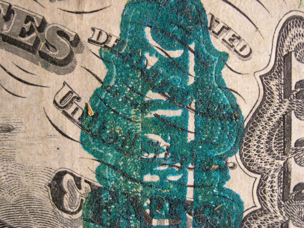 According to what I have read so far, the ovals on the face of a third issue, Justice 50 Cent Fractional, are supposed to be bronze in color. This is true of the large 50 printed on the reverse as well. Both sides of my note are in a blueish green color. It is a style F-1364 and in all the pictures and descriptions, nothing is said about this color combination. My research library is limited but even the internet sites I went to, don't refer to the blue green color. The ANA Library had extensive information about the inks that were used for printing fractional's, but again nothing other than the bronze color was mentioned. Does anyone have information on it? I have attached photographs. Higher magnifications show the blue the best.