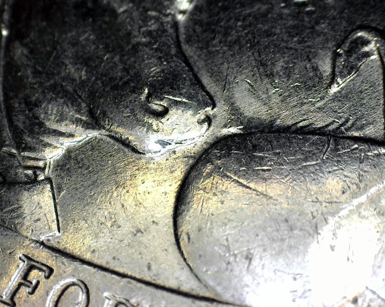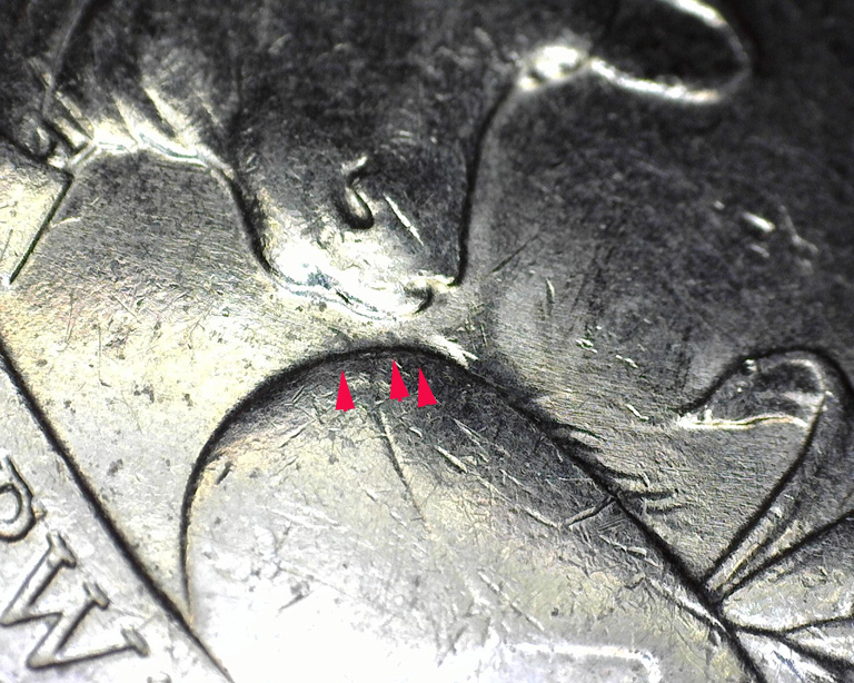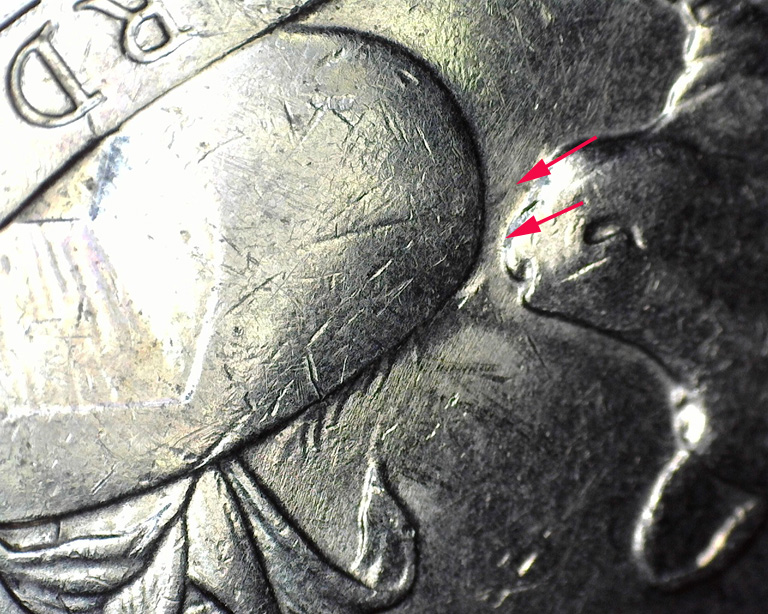 On the other hand, I have seen similar marks on CA SQ's that appeared slightly sunken because they were the result of a sub-surface die break that caused a slight recess on the coin. I examined these with my stereomicroscope at about 60x and there was no visible crater effect. I know this can happen because I found many of them in the same Mint bag that appeared on the brim of John Muir's hat and culminated in a full-blown die break at the same spot. There were also a few sunken marks on the right side of El Capitan. Unfortunately, I never found a full-blown die break for any of those.