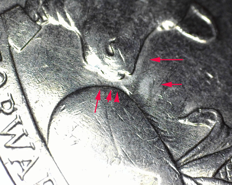 A003 - 20160411_200122.jpg A004 - 20160411_200200.jpg Like a dragon's back spread across the top of the cheese. The area along the cow's head is slightly raised, is appears. The line where an arrow is pointing is PMD and the line in the cheese below the spikes is PMD....both obvious scratches when you look at the coin through a loop. Still, haven't seen one like this before so it is interesting.