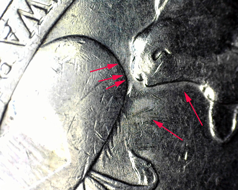 Here are two photos of both sides of the whole coin and then several closeups of the area in question rotated and slanted at different angles of the area. I have put arrows to a few of the areas, especially the very light pointed parts on the side of the cheese that you see easier on rotating the coin under a loop and light. Be anxious to see your responses. Thanks!!