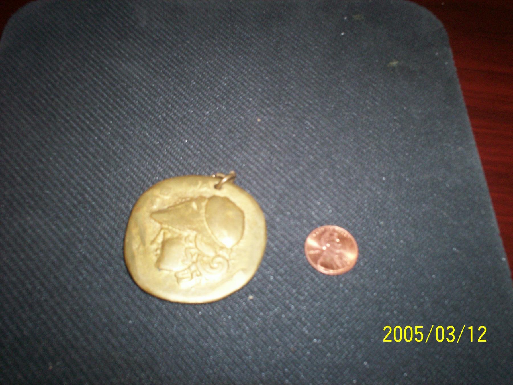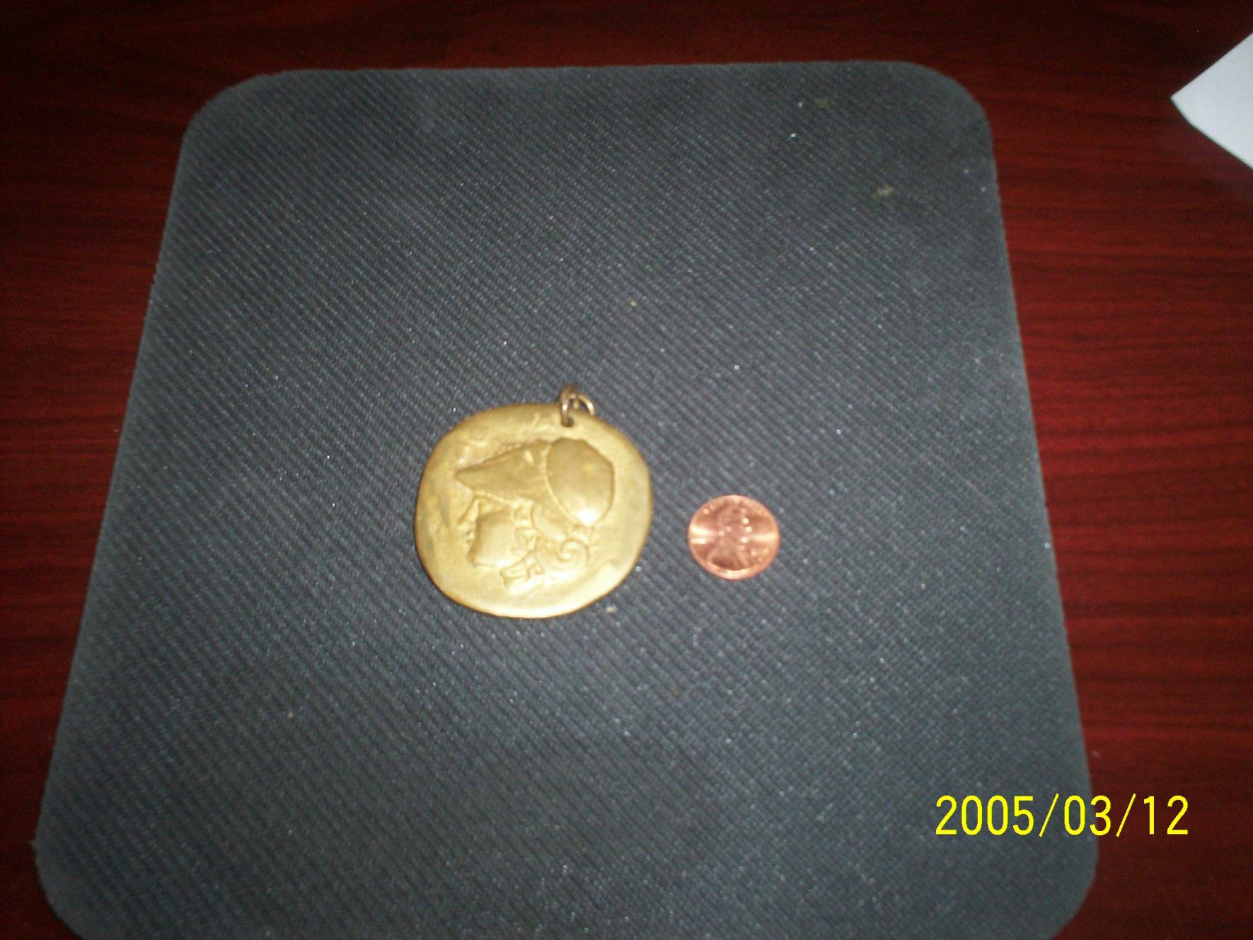 Looks like a souvenir trinket. I have seen similar. The obverse is copying an ancient Greek coin, the reverse is a picture of the acropolis. No authentic ancient coins looked like that. My bet is it was bought either in Greece on a vacation, or a Greek related store. It sure would look cool around the neck. The reverse is worn more than the obverse, so you can see that is what happened. Chris