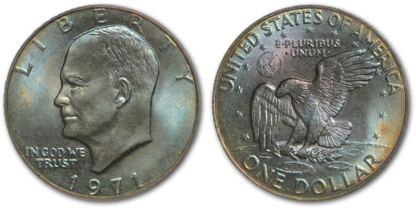Although the Eisenhower Dollar looks unreasonable from what I've seen over the years, it's also quite possible from what I've seen over the years. Getting a good look at the reeded edge might offer some answers since if "heat" is applied, it will discolor that copper edge but if the coin is in a 2x2, it's possible that the edge could be left undisturbed. CnClad coins react differently in different environments. This 1971 turned blue in a Capital plastics holder along with the other coins in the collection. While it does not exhibit the target toning of the IKE that the seller has it does exhibit a bright gold area on the reverse which some of the CnClad coins do in fect develop. Given the fact that the rest of the sellers coins exhibit the same toning patterns, I'd would be a safe bet to assume that the coins have been messed with some way or another.