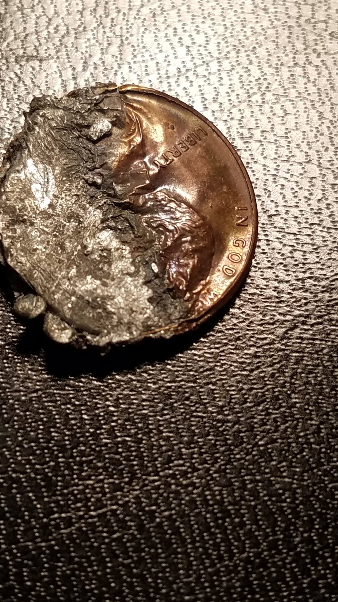 It's either been melted by heat or by acid. I remember when I was first shown the difference between the old copper cents and the new zinc ones. A friend, who was an amateur jeweler, used her torch to heat a copper penny. It heated up, glowed red and nothing else. Then she did the same to a zinc penny. It began to heat up, then suddenly it melted into a round, white glob of zinc. The copper it was plated with just seemed to disappear. I was surprised and amazed.