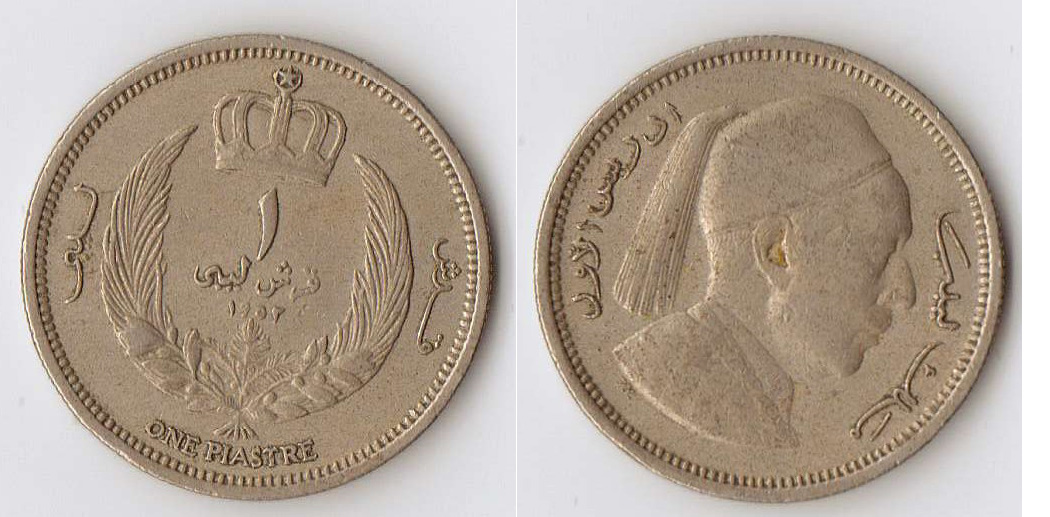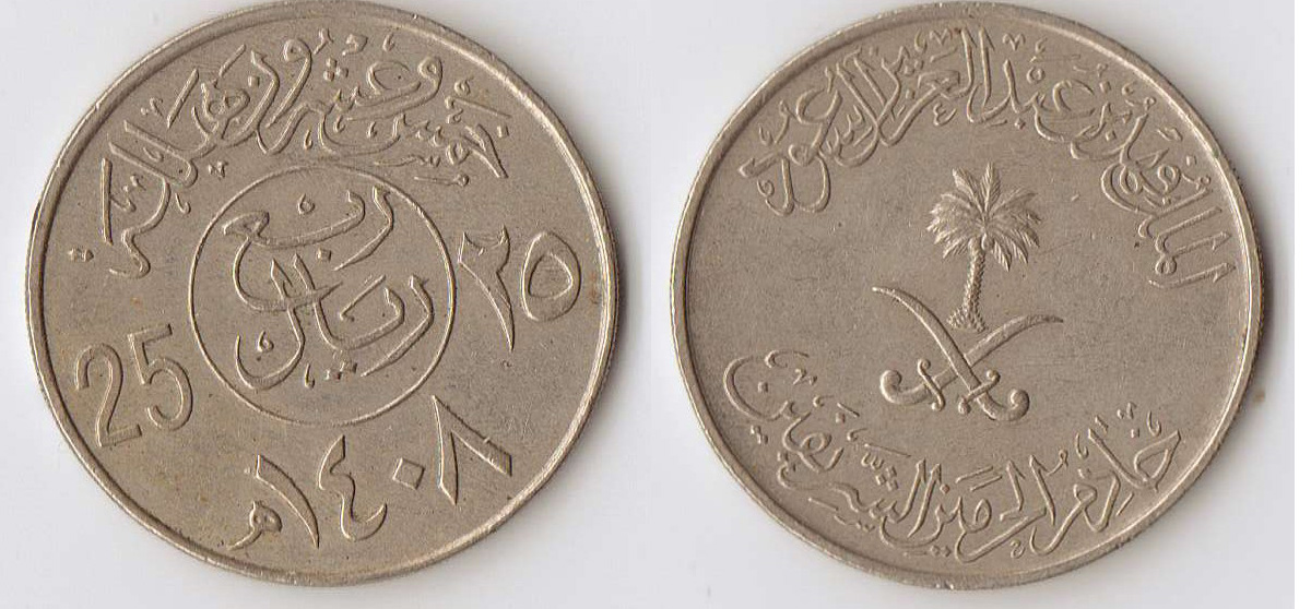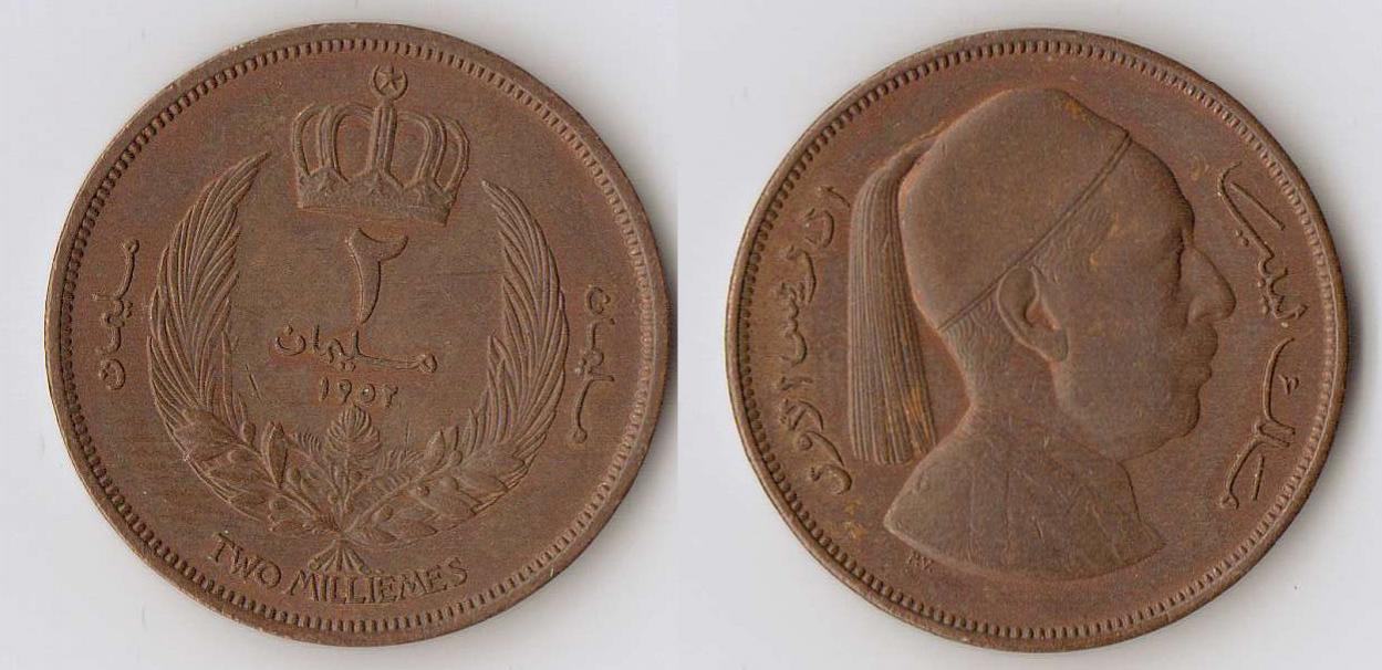 1) libya , 2) libya , 3) saudi arabia upper : 2 Milliems "MILLIM" in Arabic , year : 1952 middle : 1 libyan Piastre , "QIRSH LIBY " in Arabic , year : 1952 bottom : 1/4 Rial | 25 Halala of Saudi Arabia , year : 1408 AH
