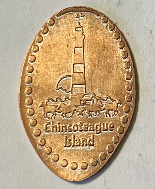 Still us but the shape has been changed. These are elongated or rolled cents, all from Chincoteague, VA. It’s a National Seashore with lifeguards from Memorial Day until Labor Day. A wonderful place to spend at the beach. Good food and the people that live there are very friendly. Their famous lighthouse. They have a small museum with the original light from this lighthouse.