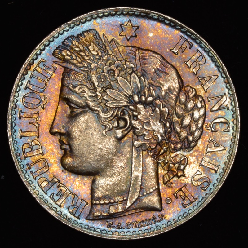 Falling in love with the colors of a coin is possibly not the best reason for purchase. But, that's what I did when I bought this coin off eBay. While waiting for it to arrive from Germany it struck me that the colorful toning might be mostly the result of PCGS's True Coin photography and that it would be less colorful in hand. Not the case...you can stand 10 feet away from this 2 Franc piece and see the colors which are magnificent! I won't try to duplicate PCGS photography but I did grab just a quick photo in Auto mode without any special light setup from 5' away with a little zoom-it winks at you from across the room. Couldn't be happier.
