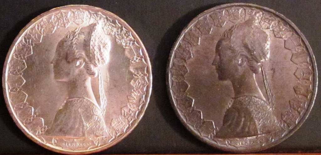 1952 Italy 10 Lira Plough Ears of wheat Aluminium R mm = Rome 1969 Italy 50 Lira Vulcan the god of fire and metallurgy allegorical portrait R mm = Rome 1977 Italy 100 Lira Minerva Holding Olive Tree Allegorical portrait R mm =Rome 1979 Italy 100 Lira FoA Cow and calf a llegorical portrait R mm =Rome