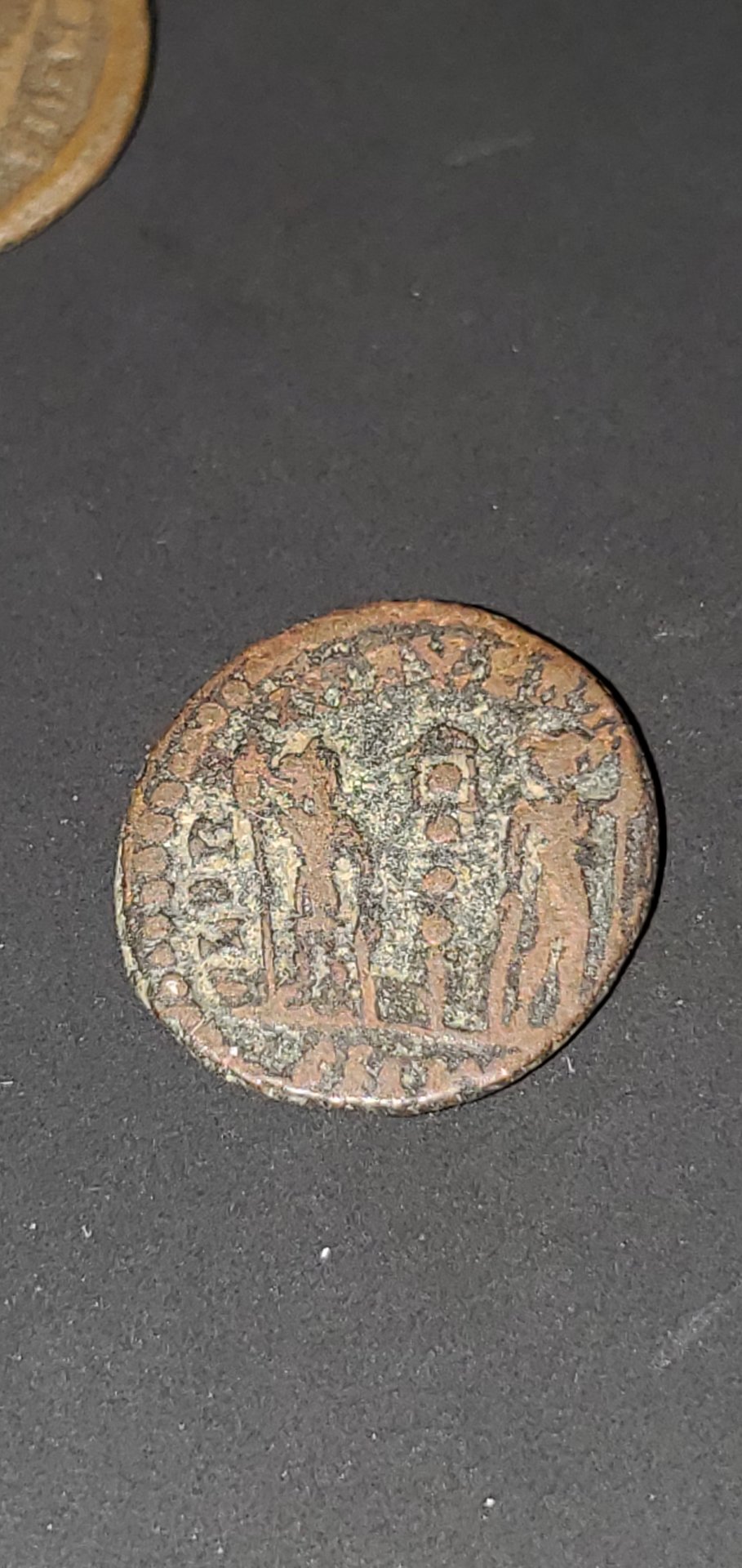 Hey, one I can participate in. My collection on Ancients is small so don't get to participate often. Just got this so seller photo. Constans, AD 337-350 Æ17, 1.7g, 12h; Siscia mint, AD 337-340. Obv: CONSTAN-S P F AVG, rosette-diademed, draped and cuirassed bust right. Rev: GLOR-IA EXERC-ITVS; two soldiers holding spears and shields with one standard between them, Chi-rho on banner // BSIS dot in crescent