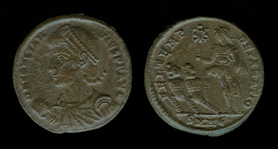 I wish the labarum were a little more clear, but with Procopius you can't be too picky. Procopius, AD 365-366 Roman Æ centenionalis, 2.70 g, 20mm. Constantinople, AD 365-366. Obv: D N PROCO-PIVS P F AVG, diademed, draped and cuirassed bust left. Rev: REPARATI-O FEL TEMP, Procopius standing facing, head right, holding labarum in right hand, left resting on shield set on the ground; Chi-rho in upper right field and unidentified object in left at foot; CONSЄ• in exergue. Refs: RIC ix 17a.7; Cohen 8; RCV 19883.