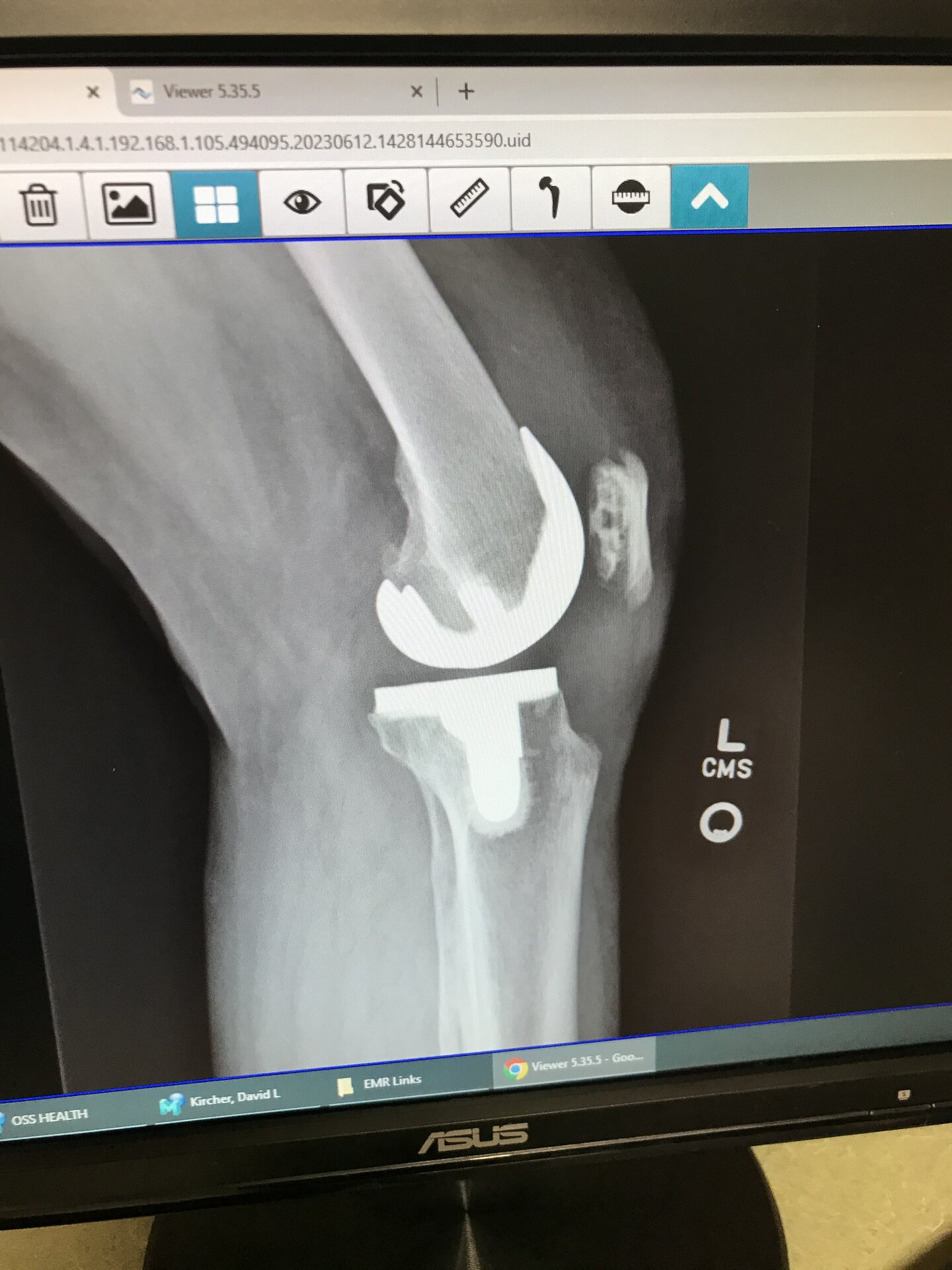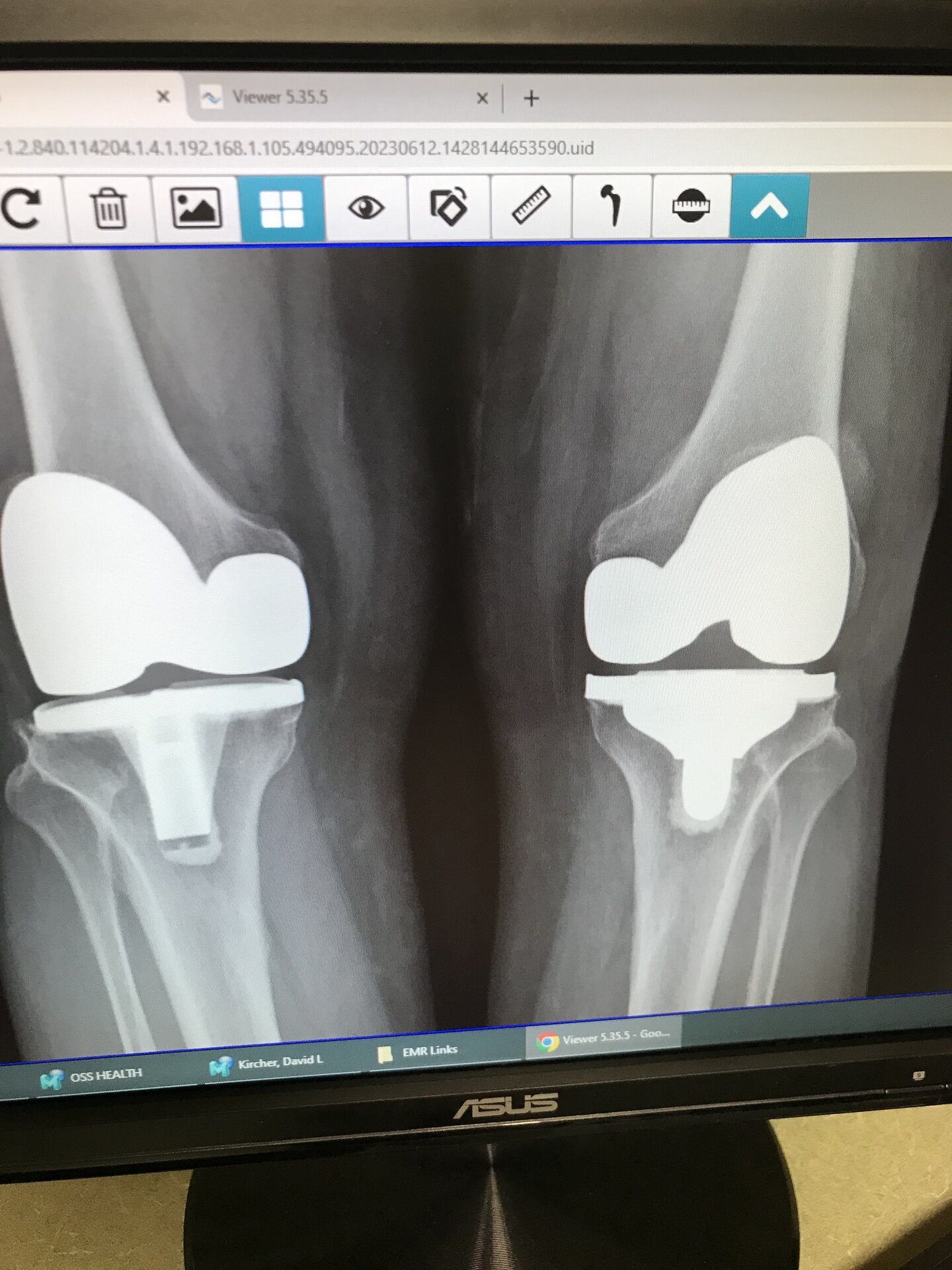 X-Rays of my knees. The one on the right is my left knee. It was done 2 years ago next month. The one on the left is my right knee that was replaced 18-20 years ago. I’d have to look it up to be sure but it’s been a long time ago. If you look and the bones and the implants you can see the difference.