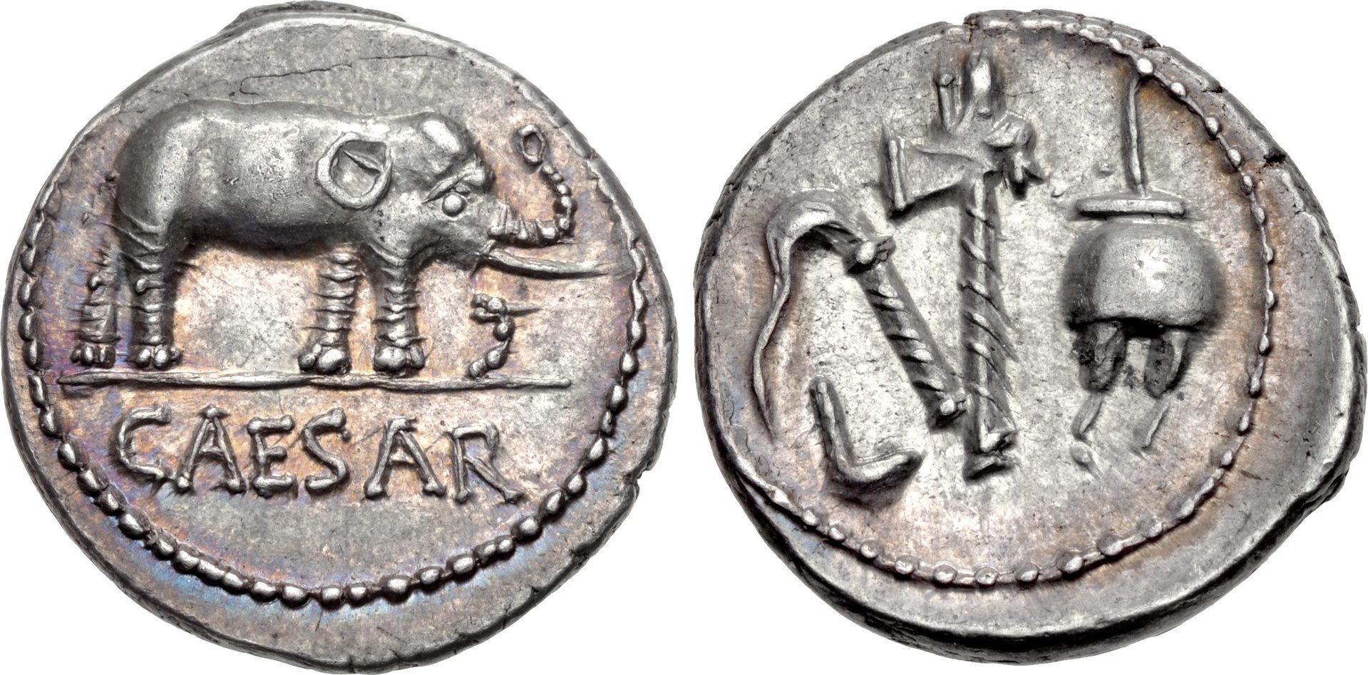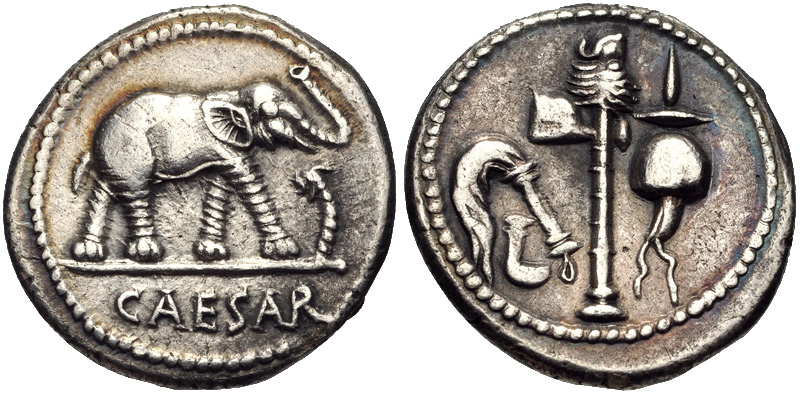 My Julius Caesar does not have an elephant, but does have the pontifical and augury implements.