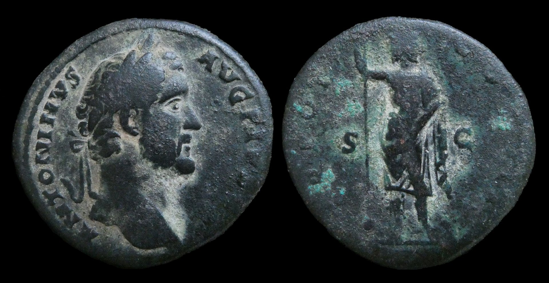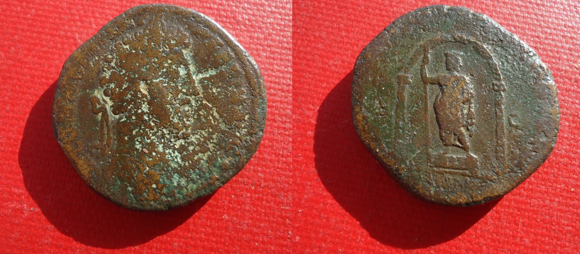 That is a very interesting sestertius, zumbly. I didn't know Antoninus Pius issued one of this type. Here is one of Commodus that is very similar - perhaps the same cult statue? Commodus Æ Sestertius (186 A.D.) Rome Mint M COMMODVS ANT P FELIX AVG BRIT, laureate head right / [P M TR P XI IMP VII] around, COS V PP below, domed distyle temple w. Janus standing facing, holding sceptre, SC across fields. RIC 460; Cohen 489; Sear 5780. (24.77 grams / 30 mm)