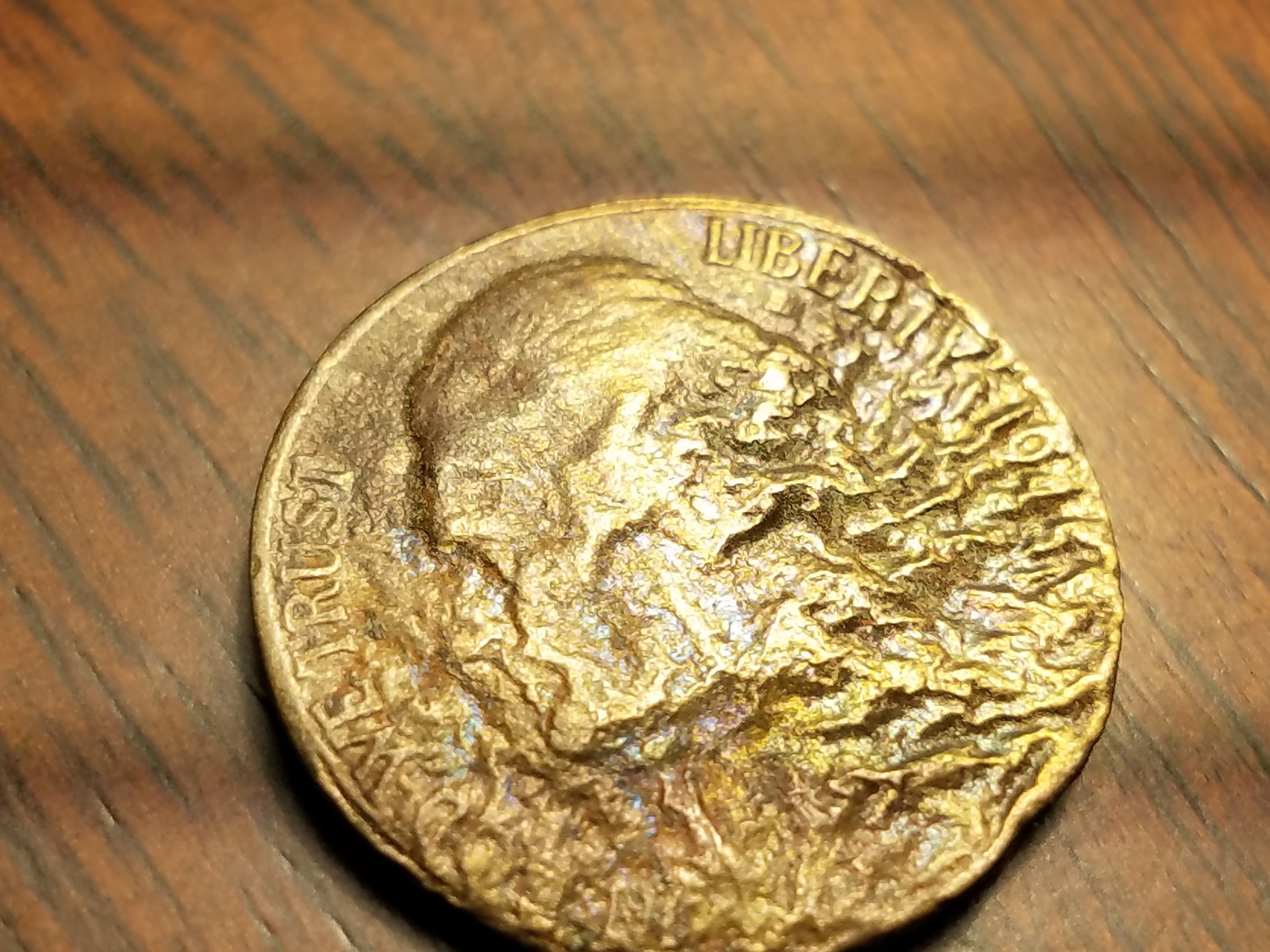 My guess is someone had a torch lighter and got the coin begin melting. Not 100% positive, but not sure what else would allow the metal to be wavy like that without marks.