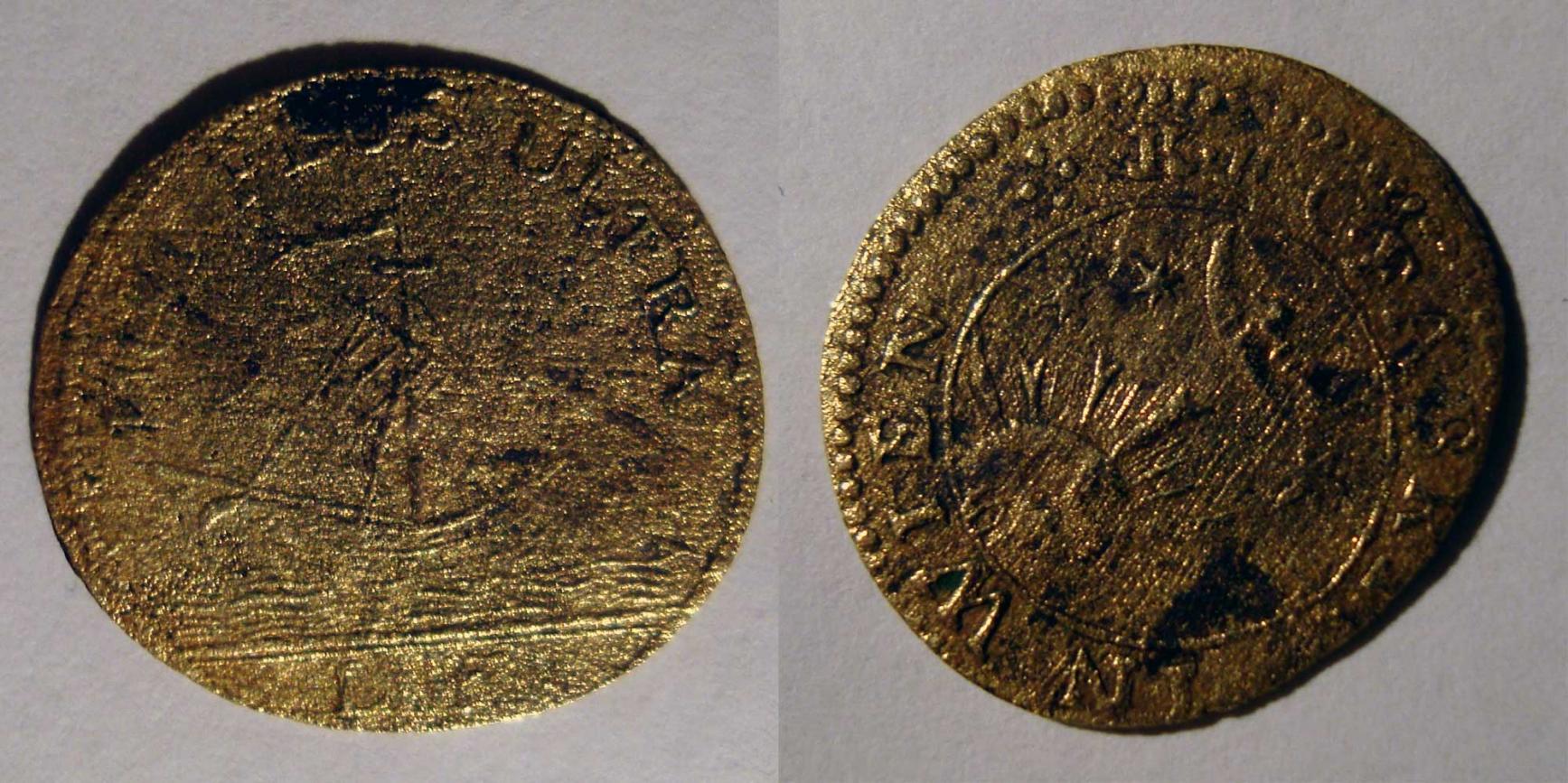 In front is readable only sign "PLUS UTRA" (probably non plus ultra), in centre most probably ship. In back is "IN WIEN" and before it looks like "FABR..." something something, in centre is sun, stars and moon.